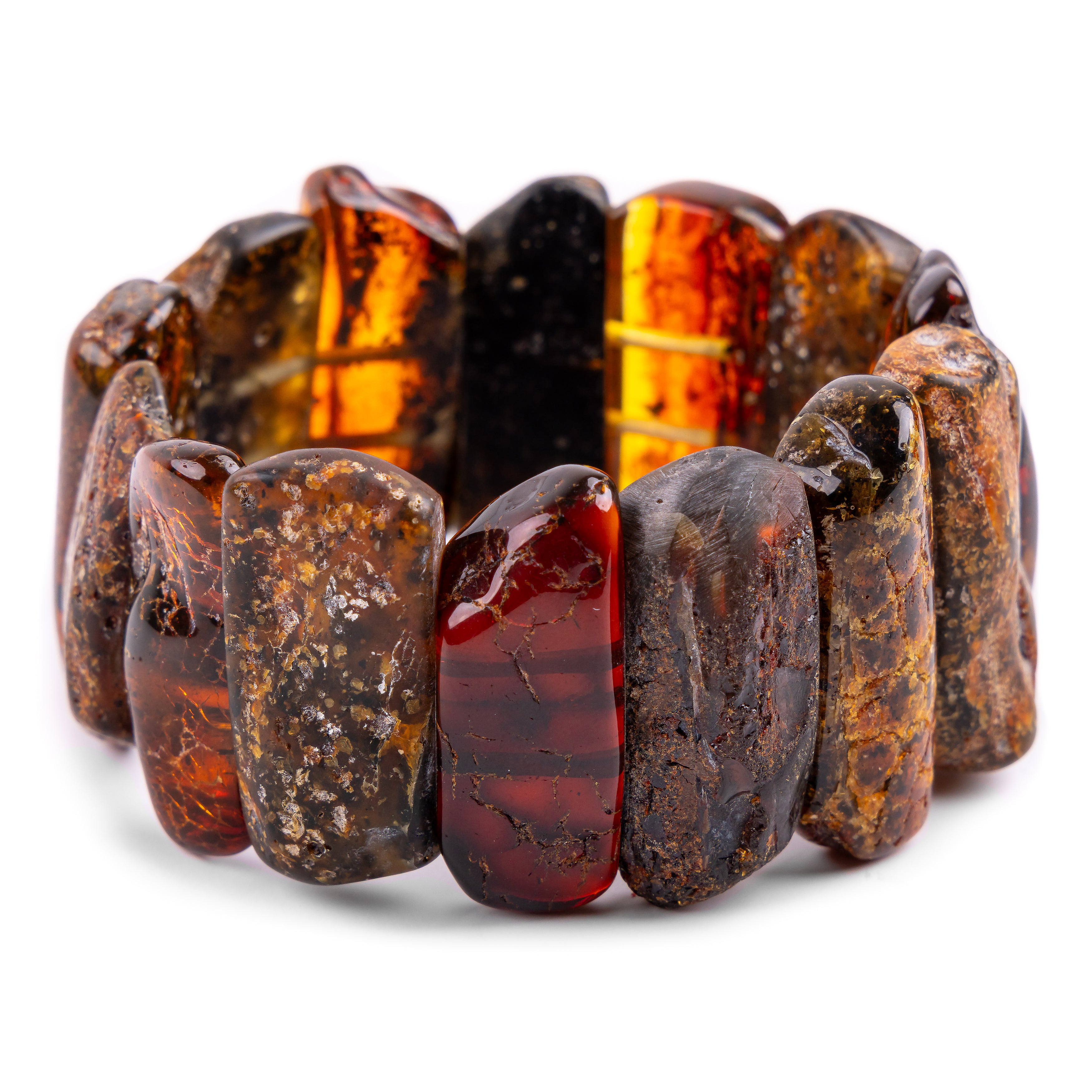 Each piece of amber is left in its natural, unpolished form, showcasing organic textures, warm golden tones, and unique inclusions that make every bracelet truly one of a kind. Set together to create a bold silhouette, the bracelet measures an impressive 40mm in width, making it a striking statement on the wrist while remaining comfortable to wear thanks to its stretch design.