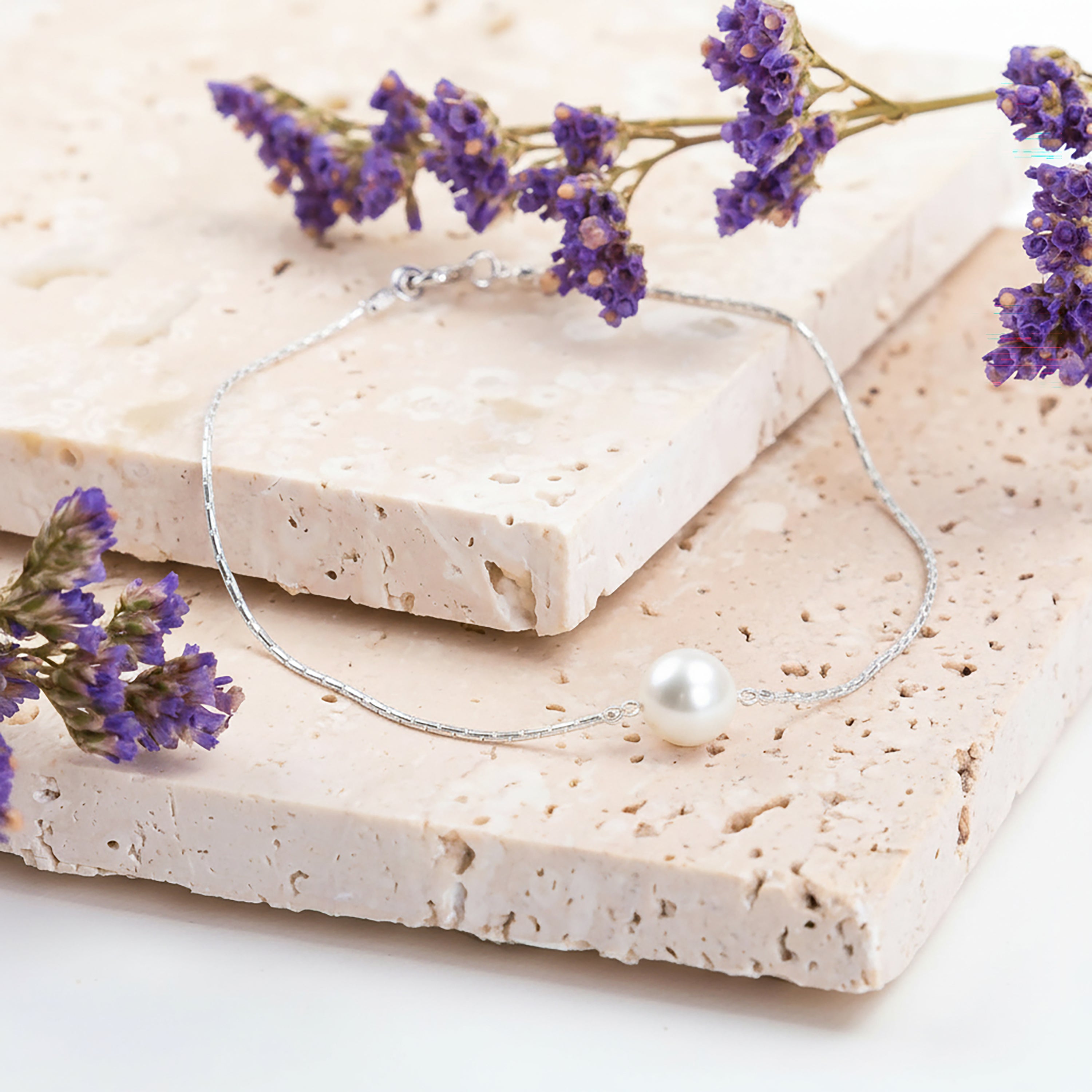 Delicate Single Stone Bead Bracelet in Silver & White Pearl