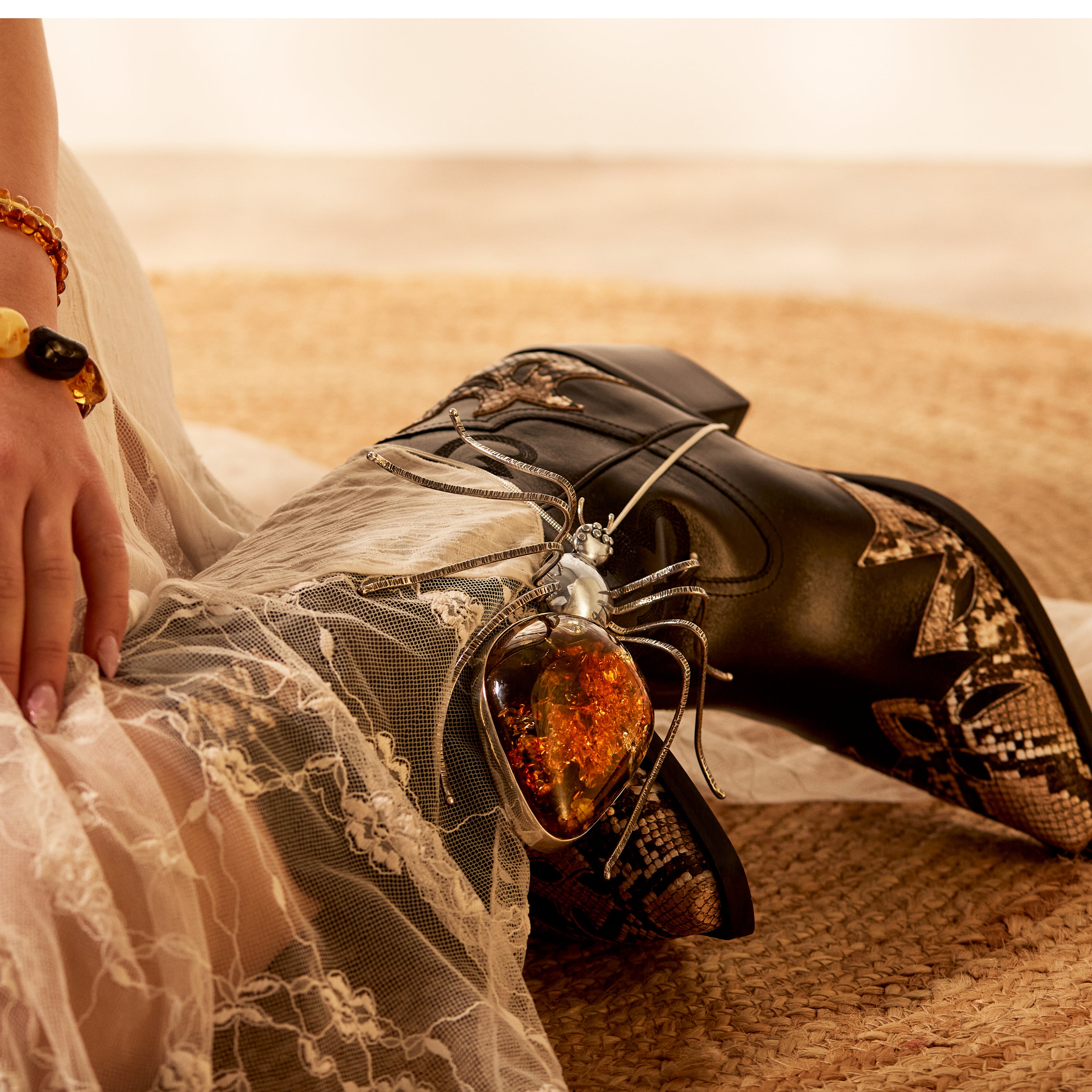 The warm, glowing amber contrasts dramatically against the cool weight of sterling silver, capturing the spider mid-prowl, alive with tension and intrigue. This is not just jewellery - it’s wearable art, bold, commanding, and unapologetically dramatic.