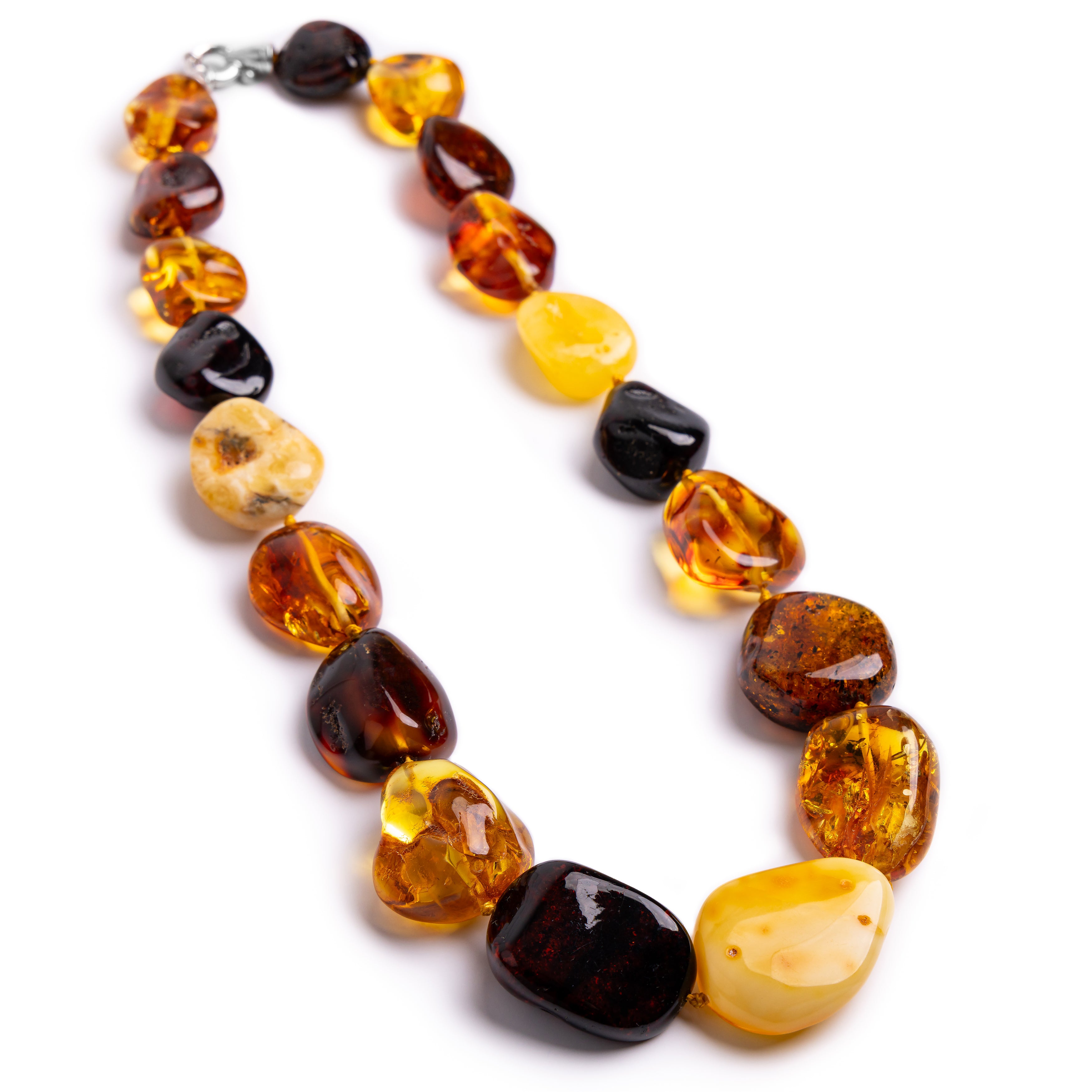 This necklace features beautifully large, natural amber nugget beads, each one shaped by nature and polished only by time. Their organic forms, rich golden hues, and unique internal inclusions ensure that no two beads are ever alike, making every necklace a true one-of-a-kind treasure.