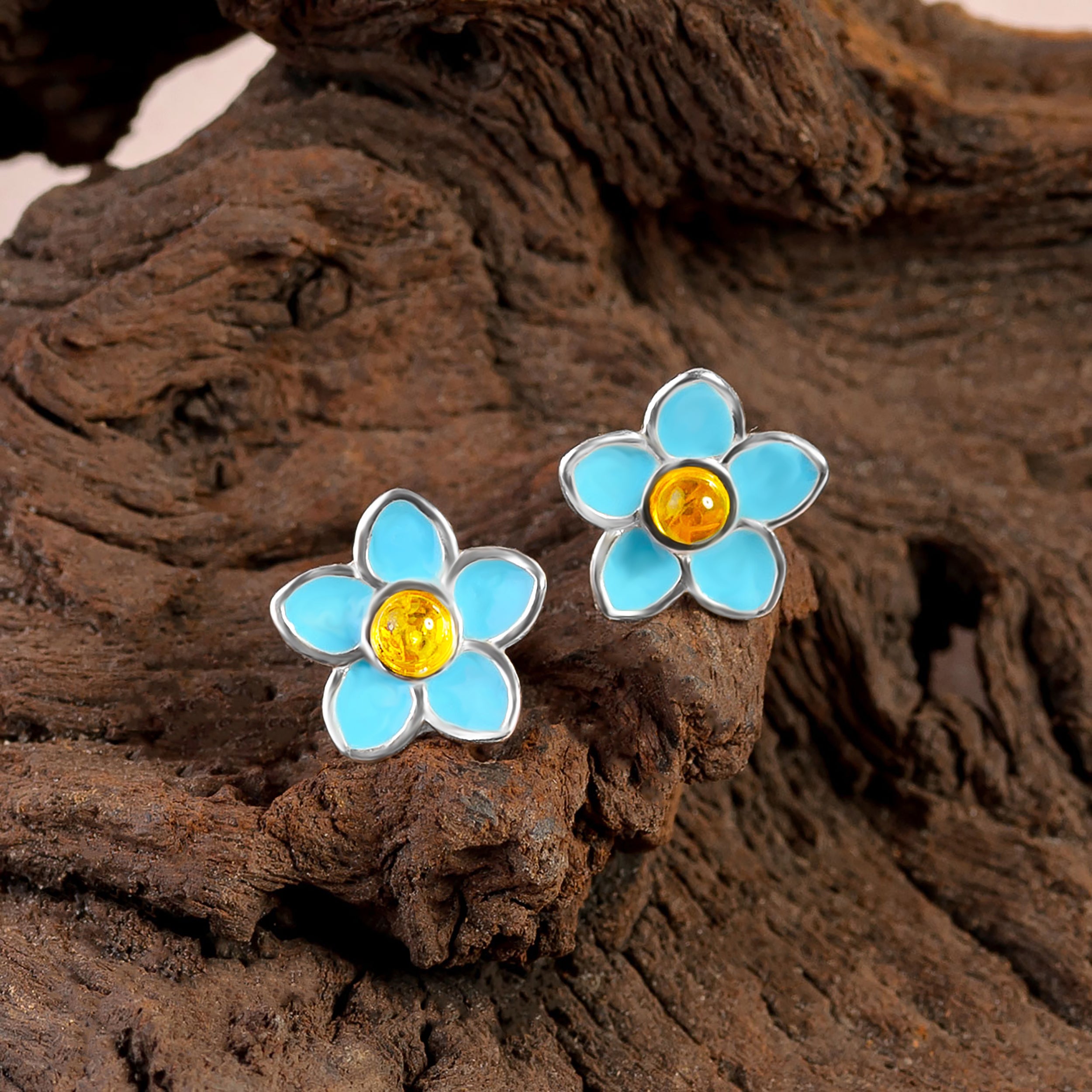 Handpainted Forget Me Not Stud Earrings in Silver and Amber