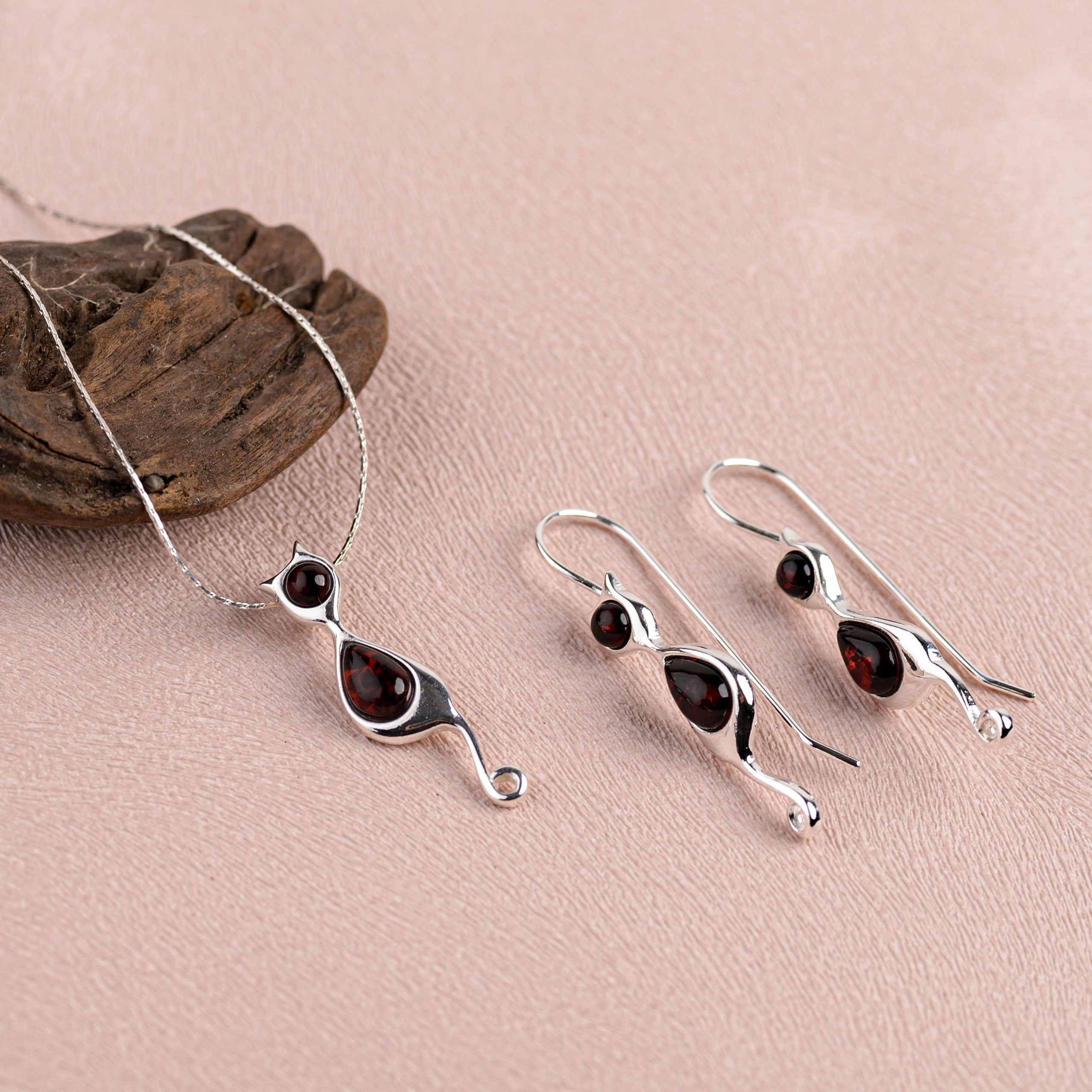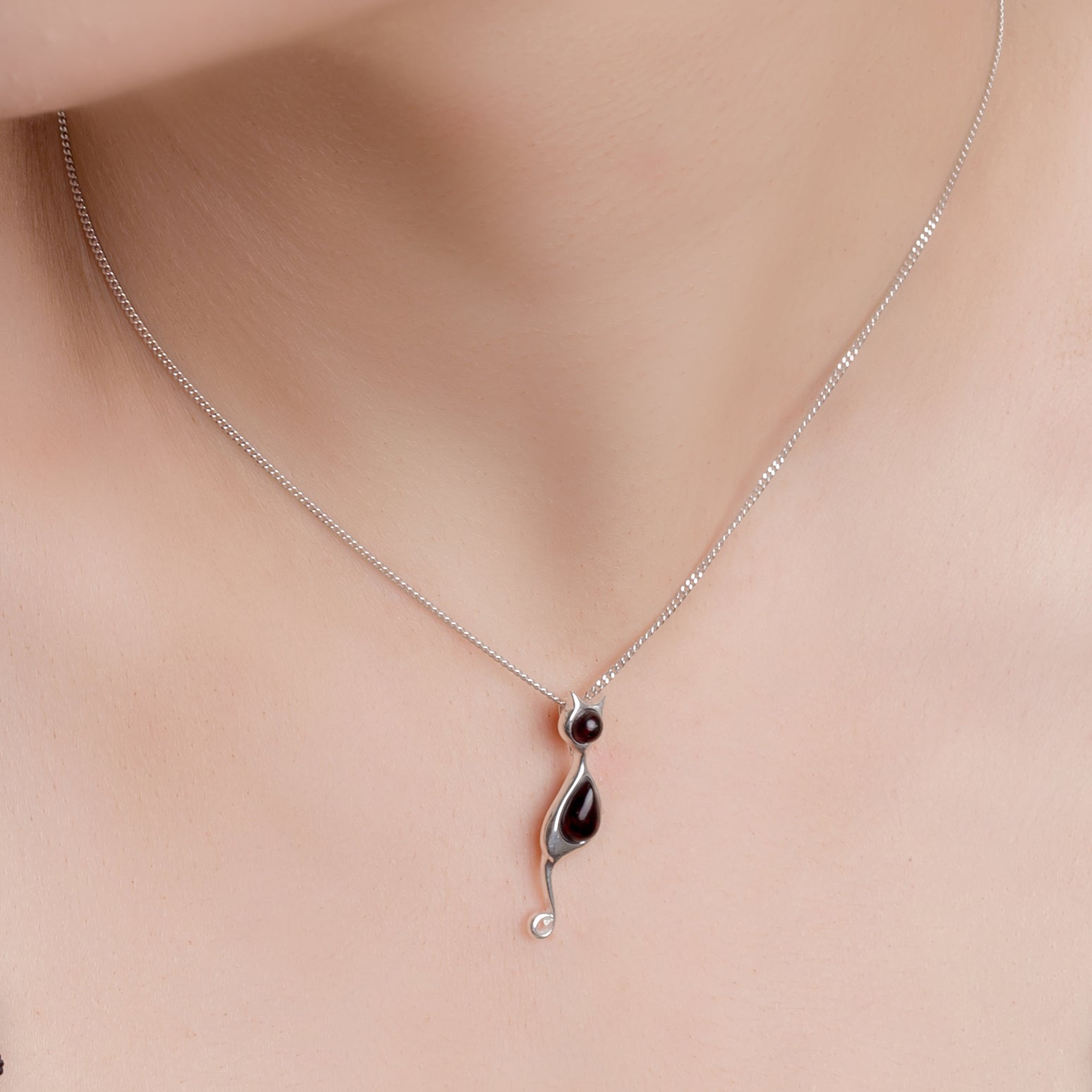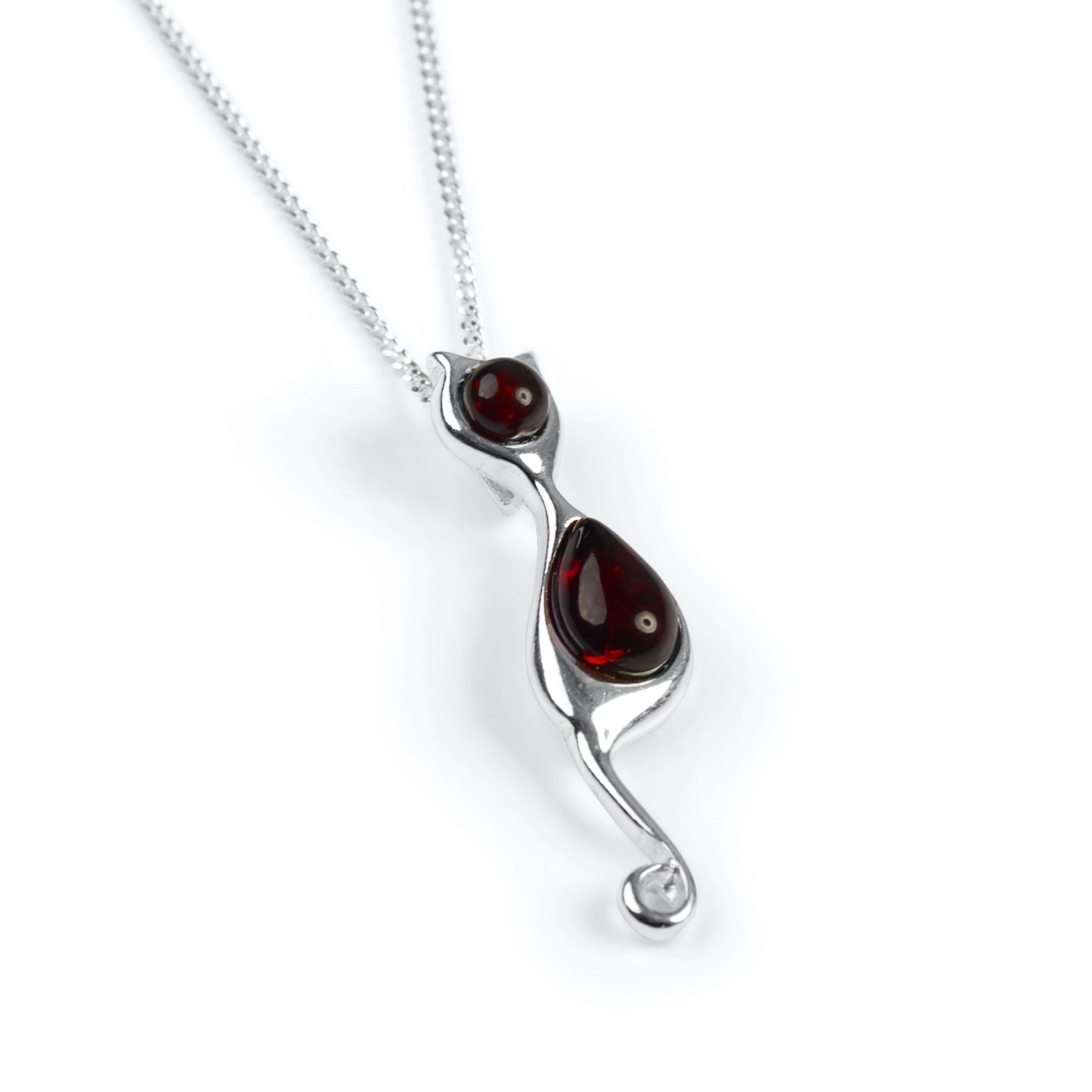 Crafted in 925 silver with genuine Black Cherry Baltic Amber to create the slender body of the cat. Along with its curved tail and silhouette shape, this necklace is full of character and charm.