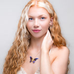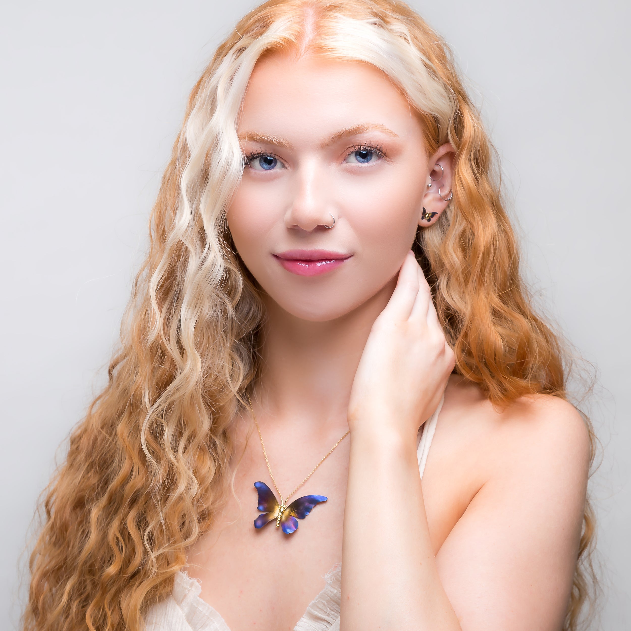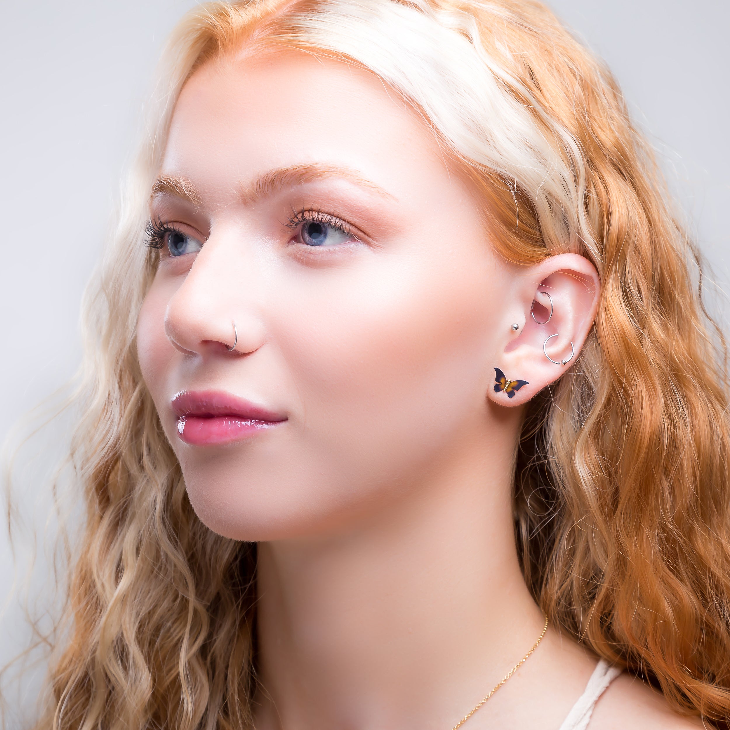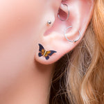 Carefully crafted in Titanium, each has been heated treated to bring out the unusual blues and gold colouring of the wings. Finished with 24ct Gold plated detailing and stem post backing.