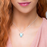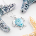 Our adorable Silver and Larimar Turtle Necklace would also serve well as a summer memory during cold winter days. Silver detailed turtle necklace with natural Larimar layered underneath to create that magical turtle shell.