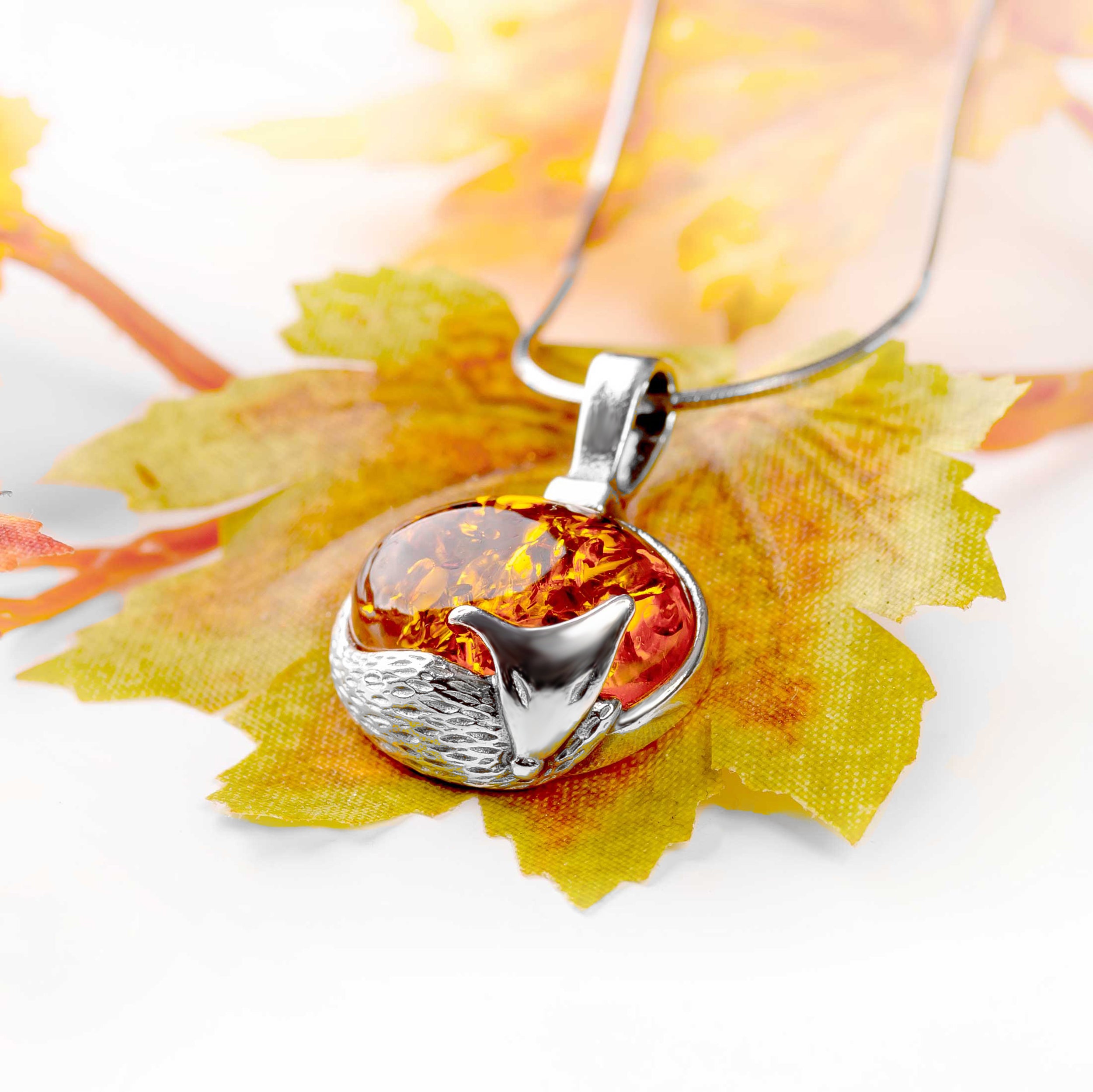 Sleeping Fox Necklace in Silver and Cognac Amber