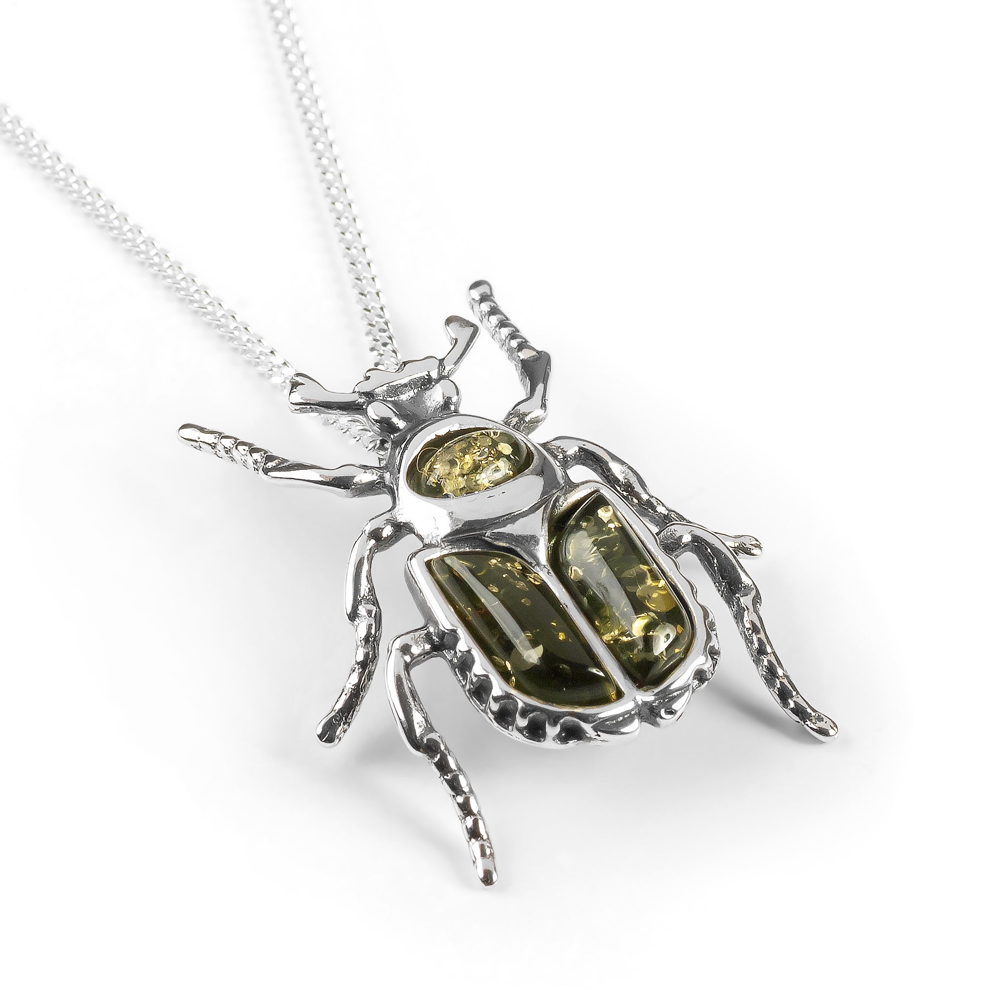 Handcrafted in Sterling Silver, the body of the Beetle is adorned with genuine Green Baltic Amber to bring our the colouring of this rare insect. With highly detailed legs and head, it is instantly recognisable. Complete with a solid silver chain.