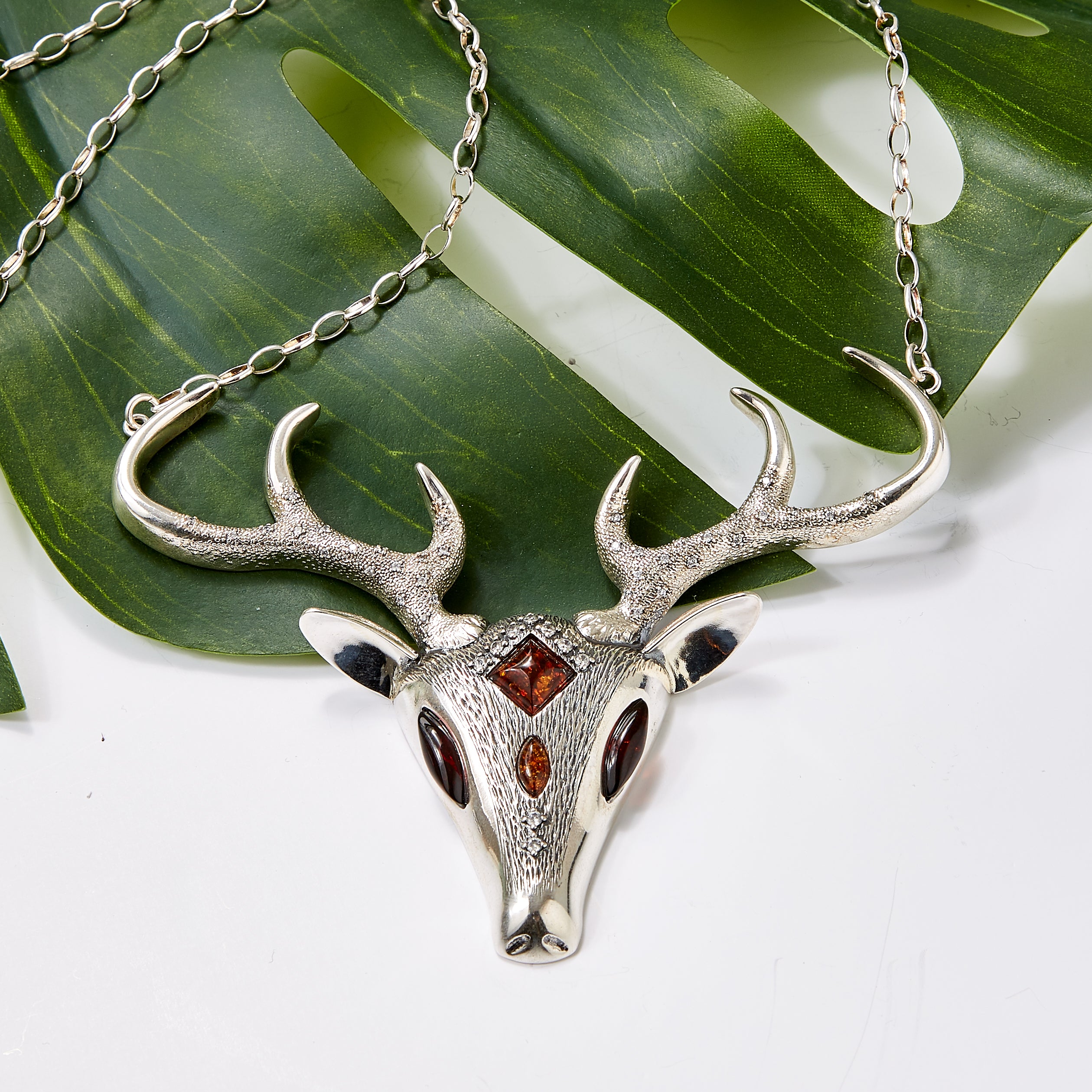 Bespoke Statement Stag Head Necklace in Silver and Amber