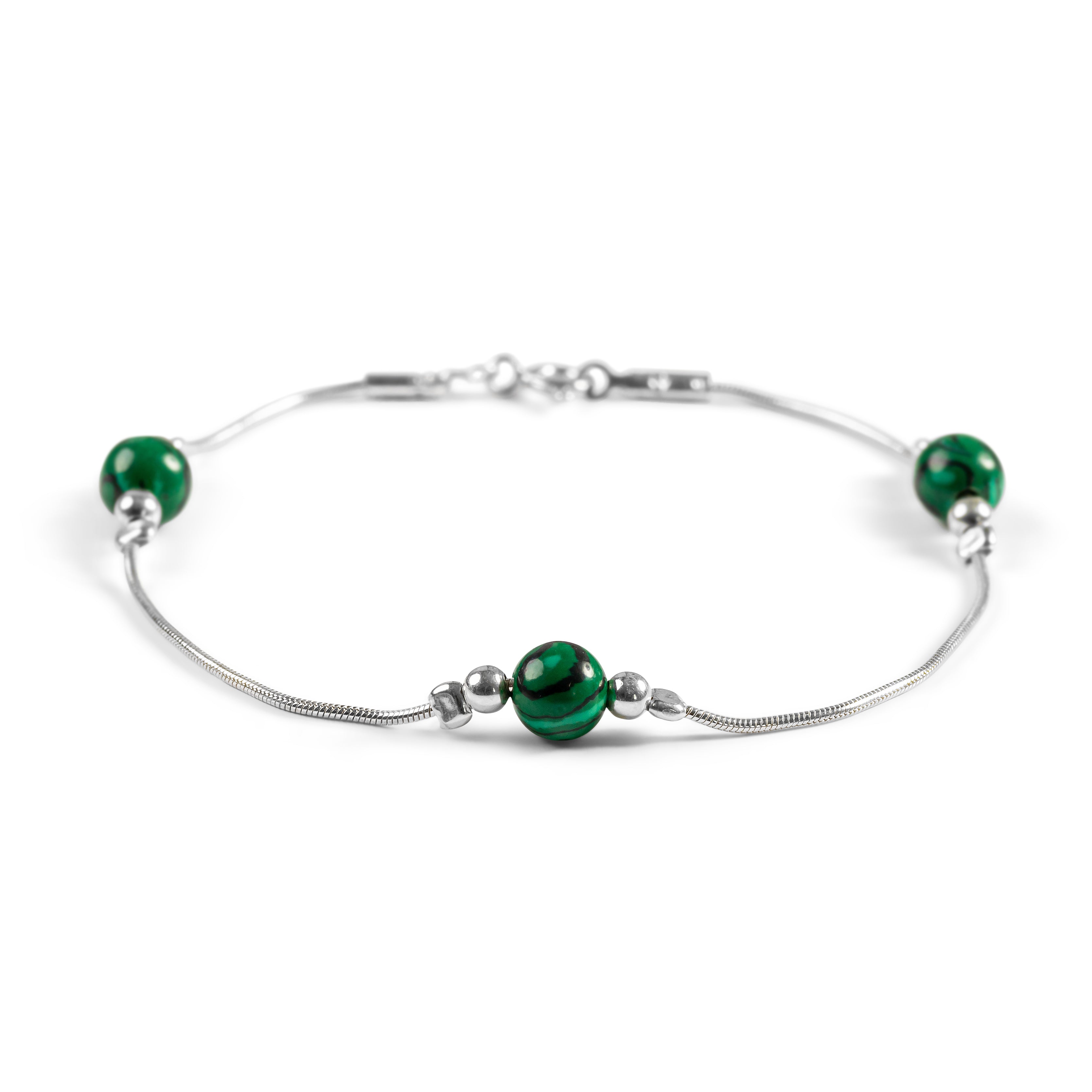 Handcrafted in 925 silver with 3 natural green Malachite gemstones spaced evenly across a solid silver snake chain. Finished with miniature silver balls either side of each stone to complete this must have jewellery staple.