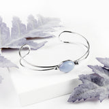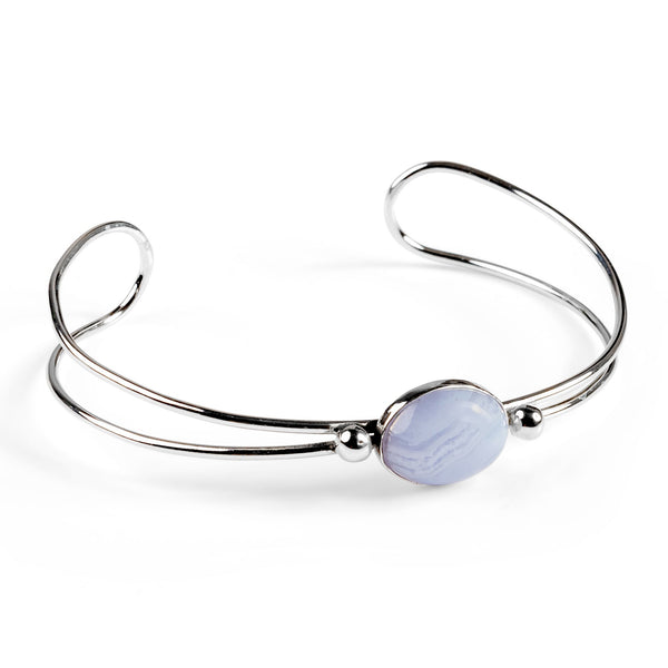 Crafted in 925 solid silver open torque bangle with a single natural Blue Lace Agate gemstone set in the centre. Easy to adjust to fit comfortably on the wrist.