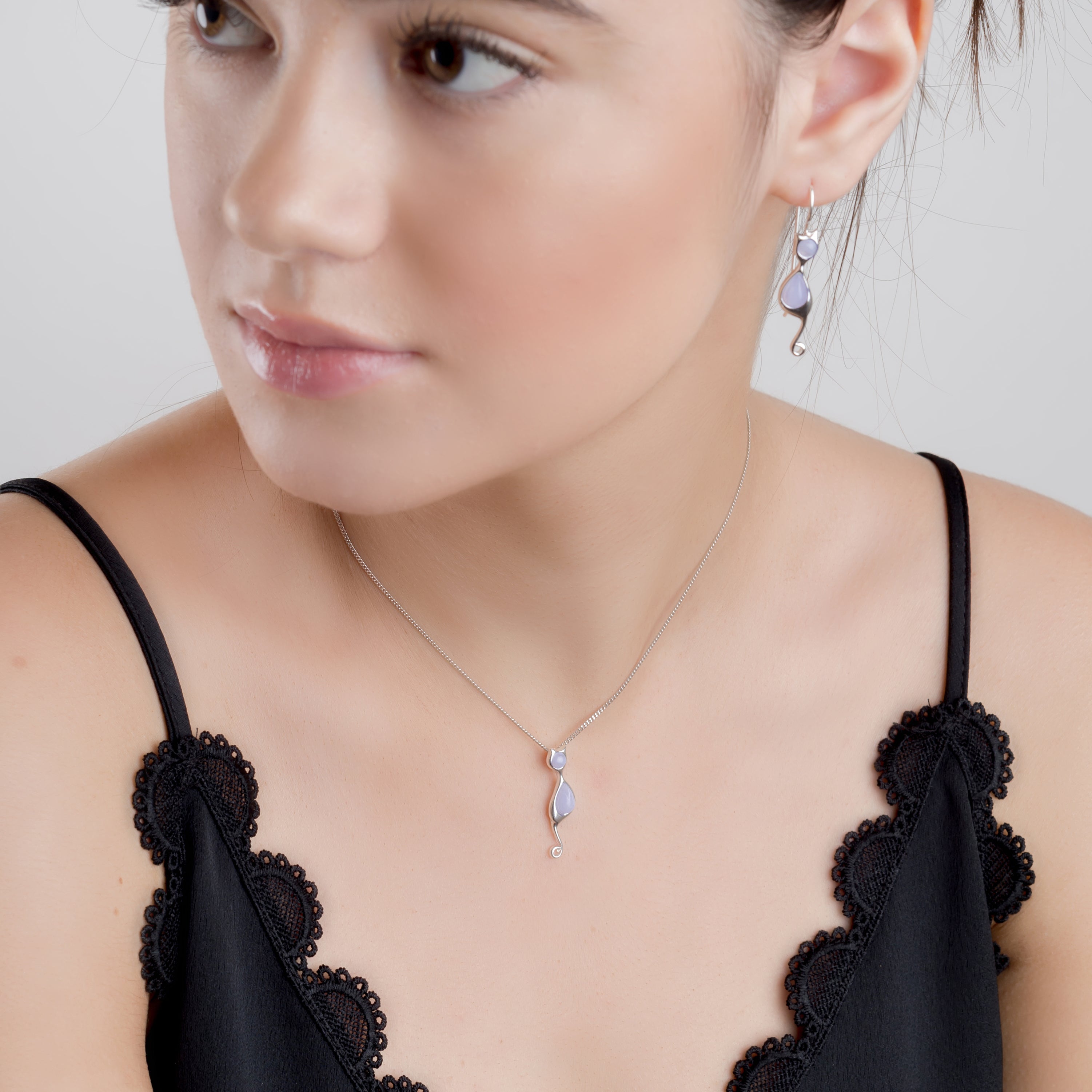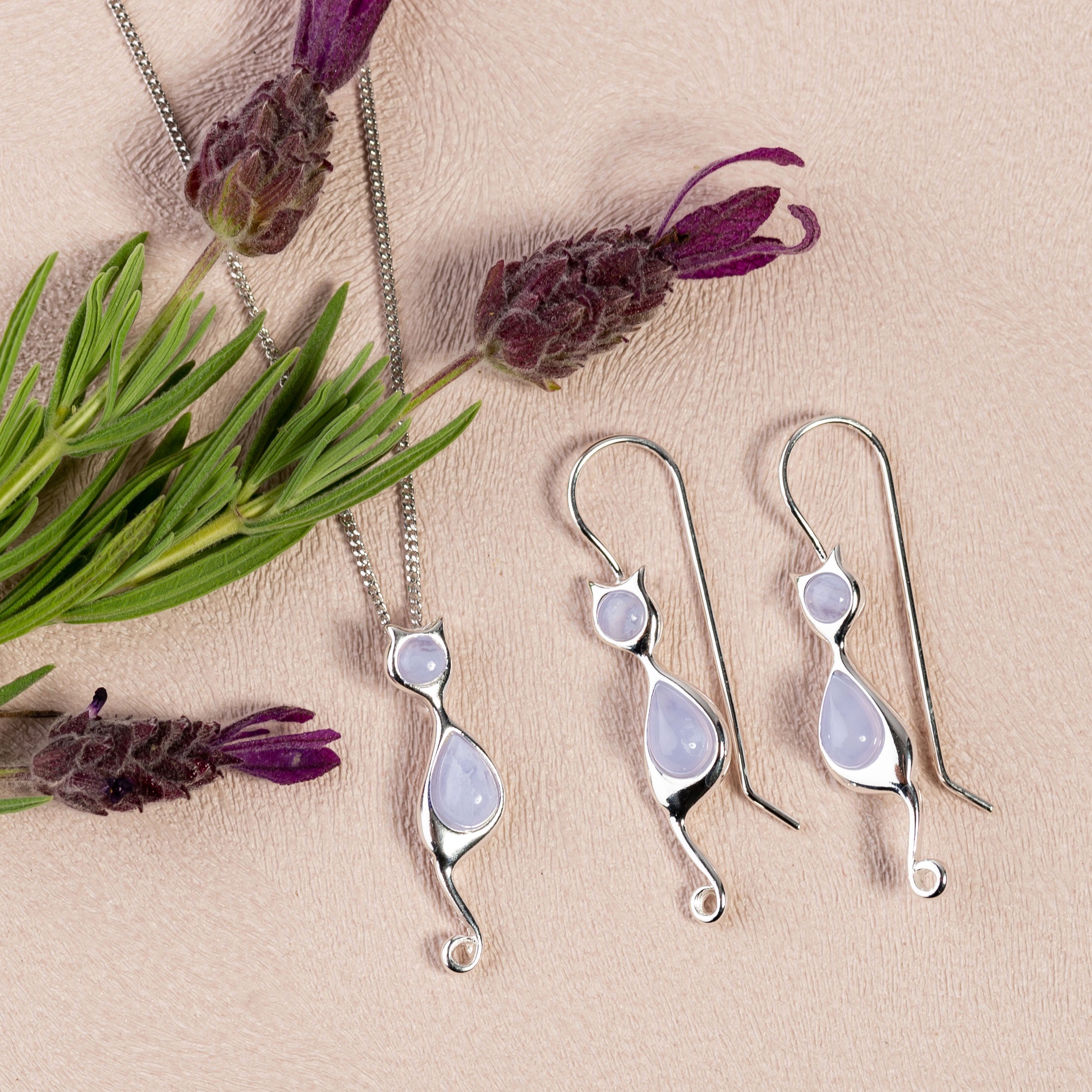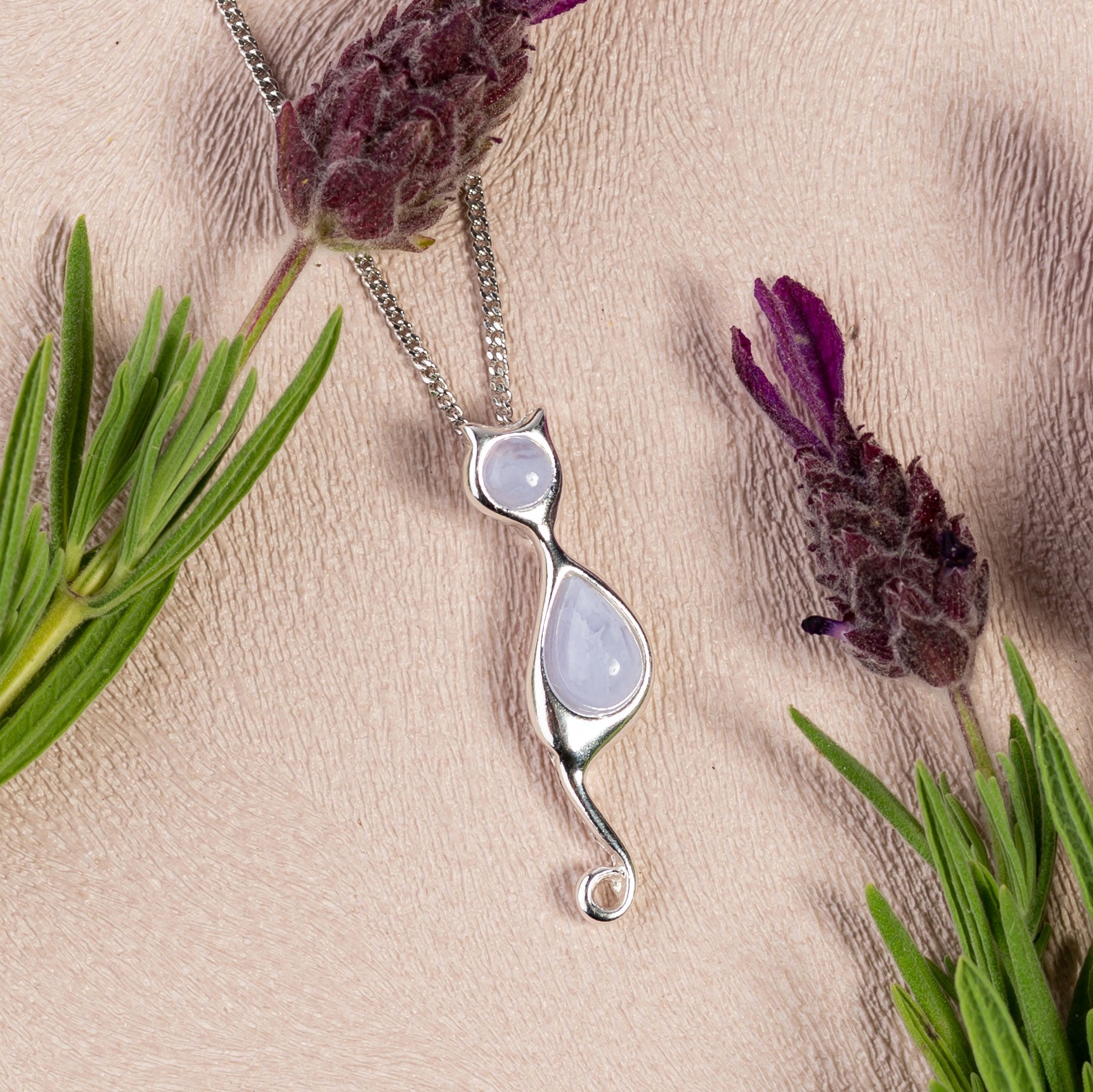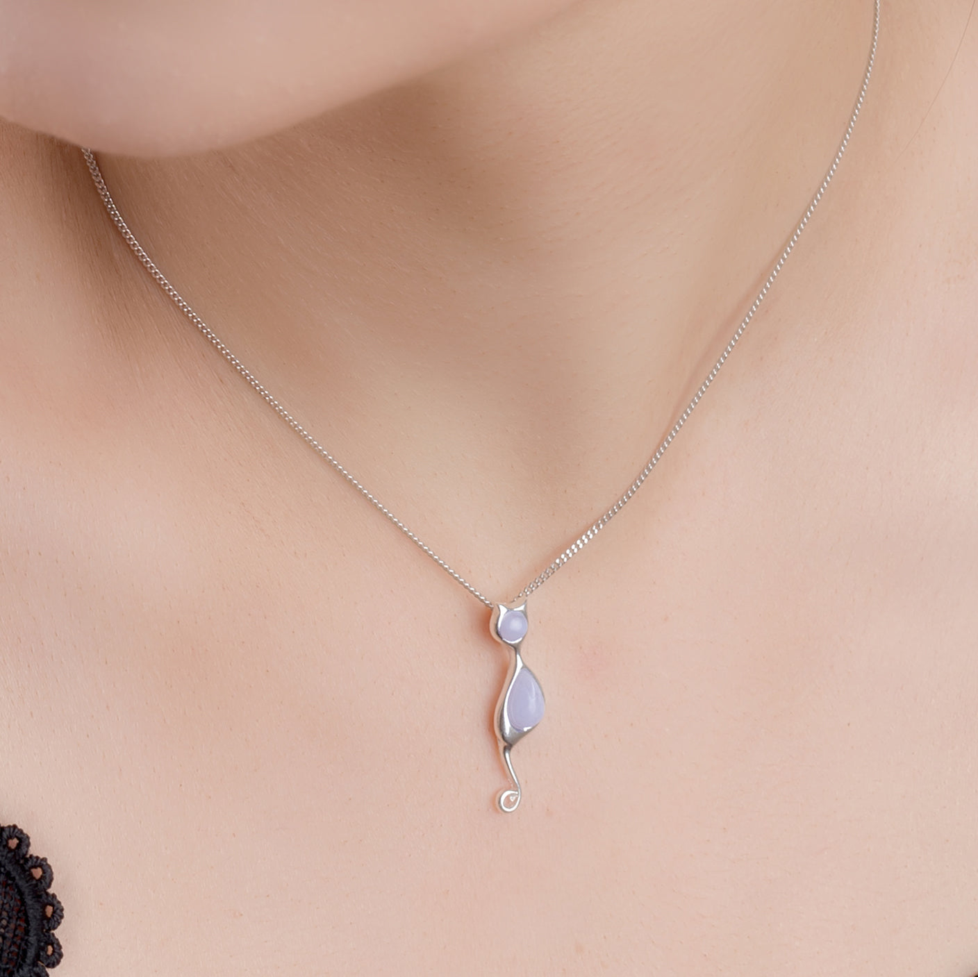 Crafted in 925 silver with natural Blue Lace Agate to create the slender body and head of the cat. Along with its curved tail and silhouette shape, this necklace is full of character and charm.