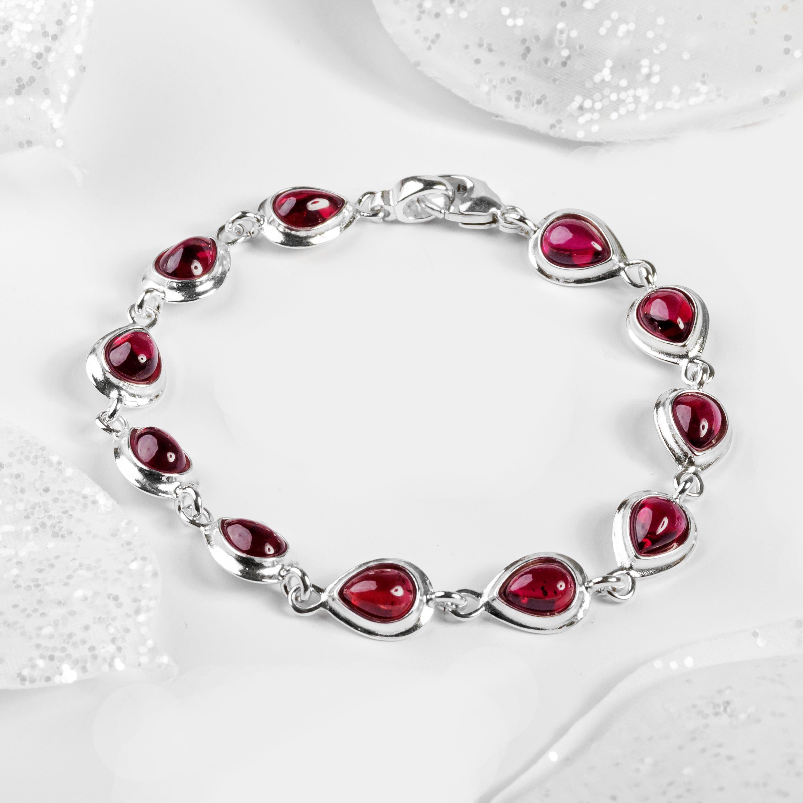 Handcrafted in solid 925 silver, this bracelet is adorned with 11 deep red Garnet gemstones which have been carefully cut and polished into a teardrop shape. Each stone is set and linked together in silver.