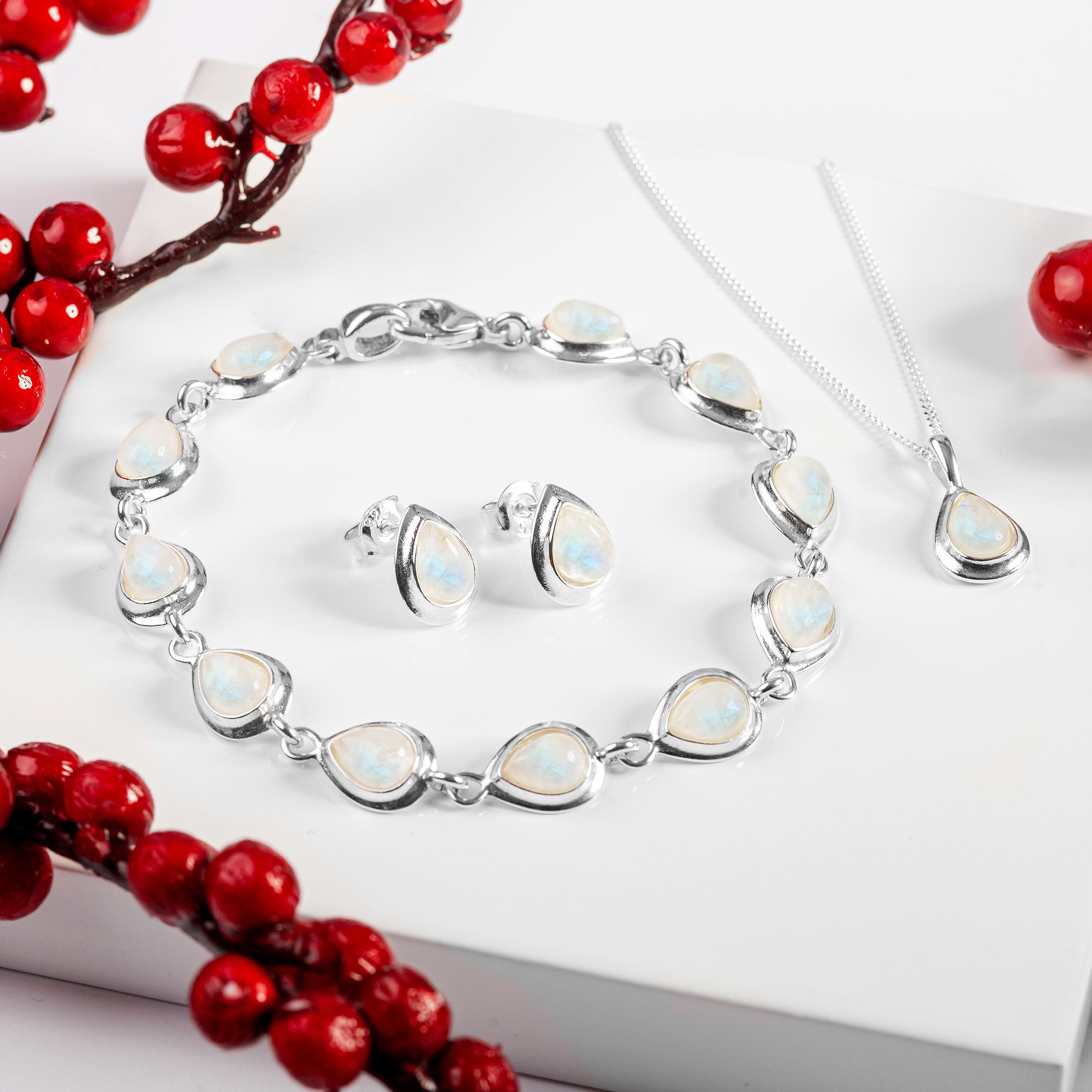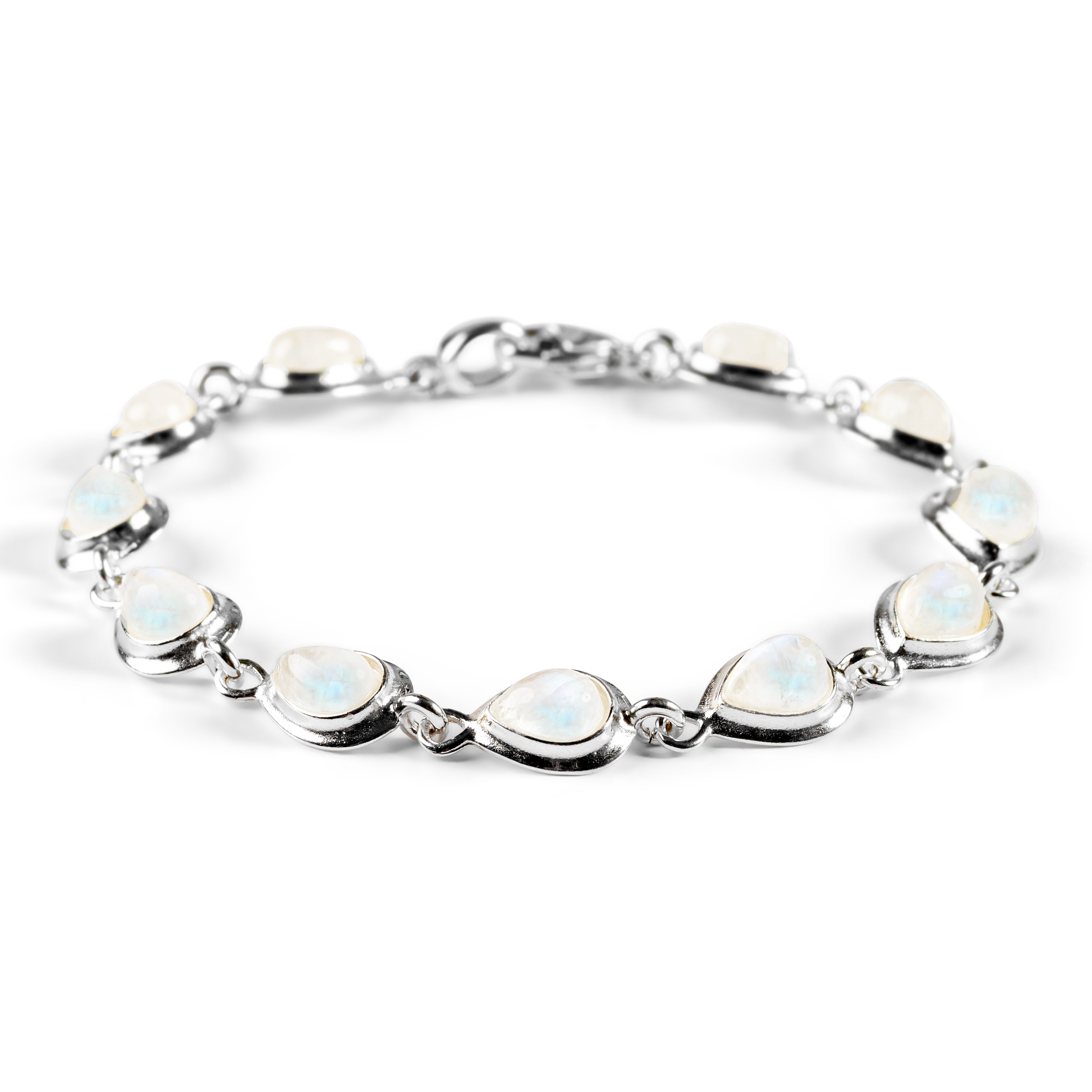 Handcrafted in solid 925 silver, this bracelet is adorned with 11 glistening Moonstone gemstones which have been carefully cut and polished into a teardrop shape. Each stone is set and linked together in silver.
