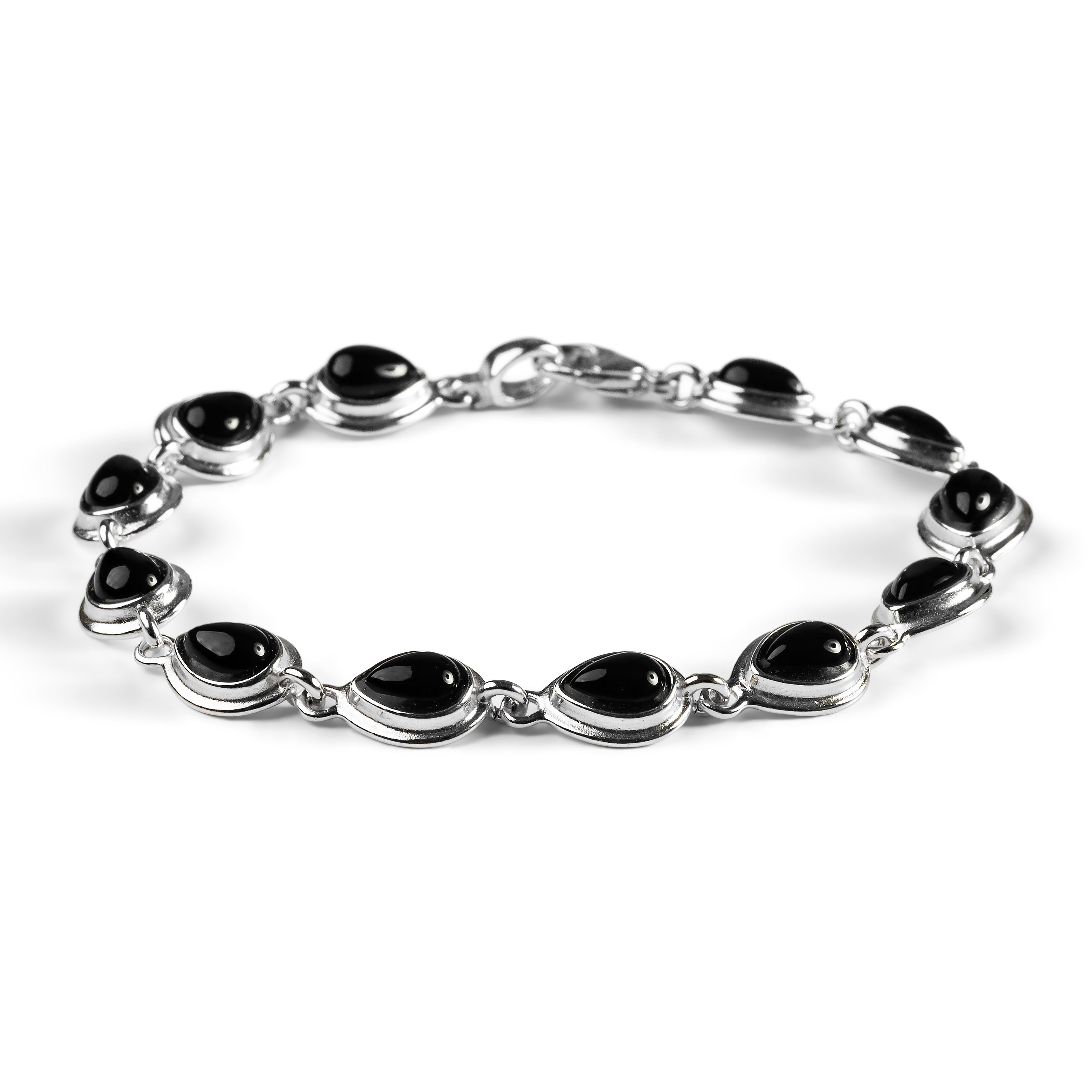 Handcrafted in solid 925 silver and finished in 24ct Gold, this bracelet is adorned with 11 Black Onyx gemstones which have been carefully cut and polished into a teardrop shape. Each stone is set and linked together in silver.