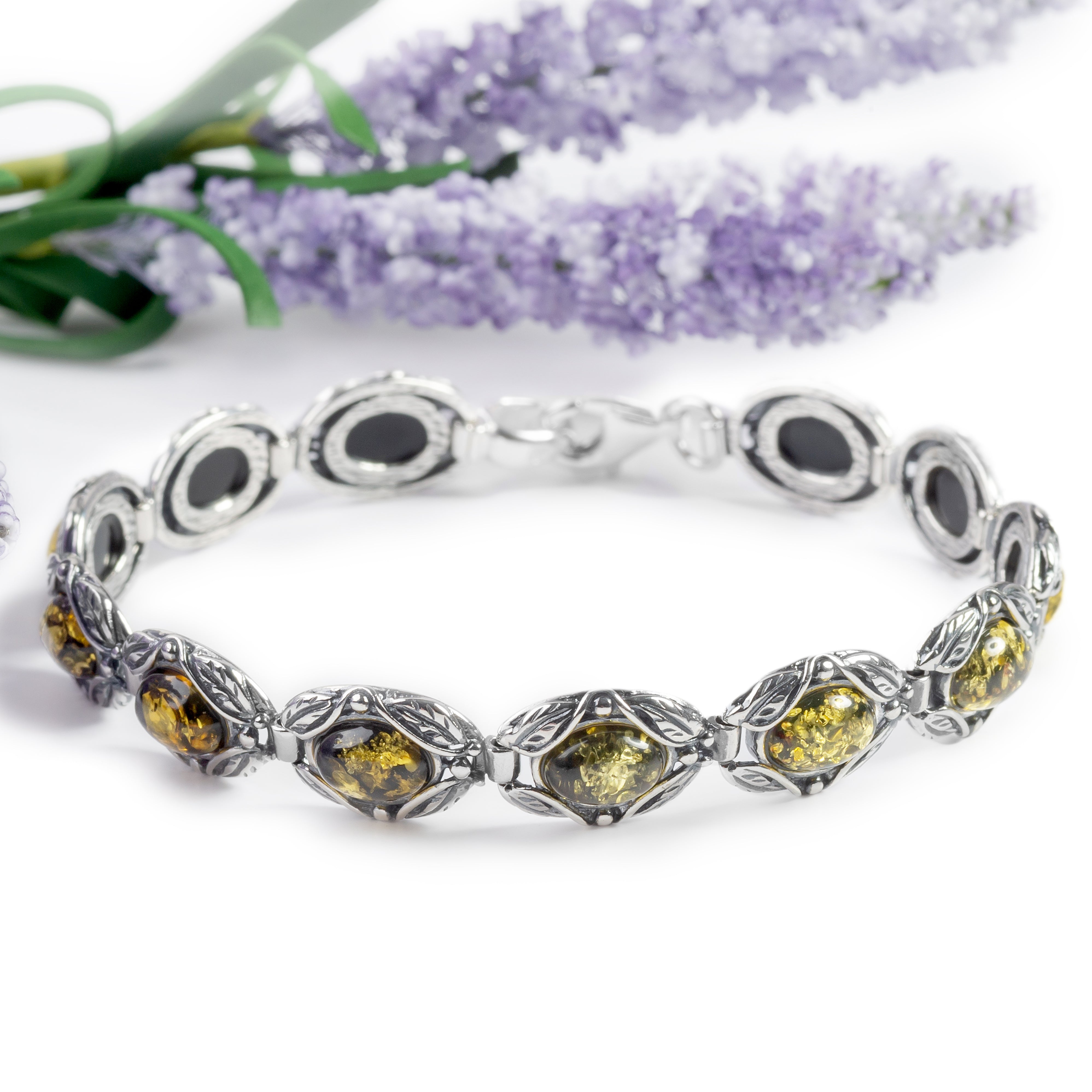 Beautifully crafted in 925 Sterling Silver, this stunning bracelet is adorned with 12 single oval shaped genuine Baltic Amber gemstones. Each stone is set and surrounded by a decorative vintage style mount and they are individually hinged together to create a classic and sophisticated accessory. Complete with lobster clasp fitting making it easy to put on and secure when wearing.