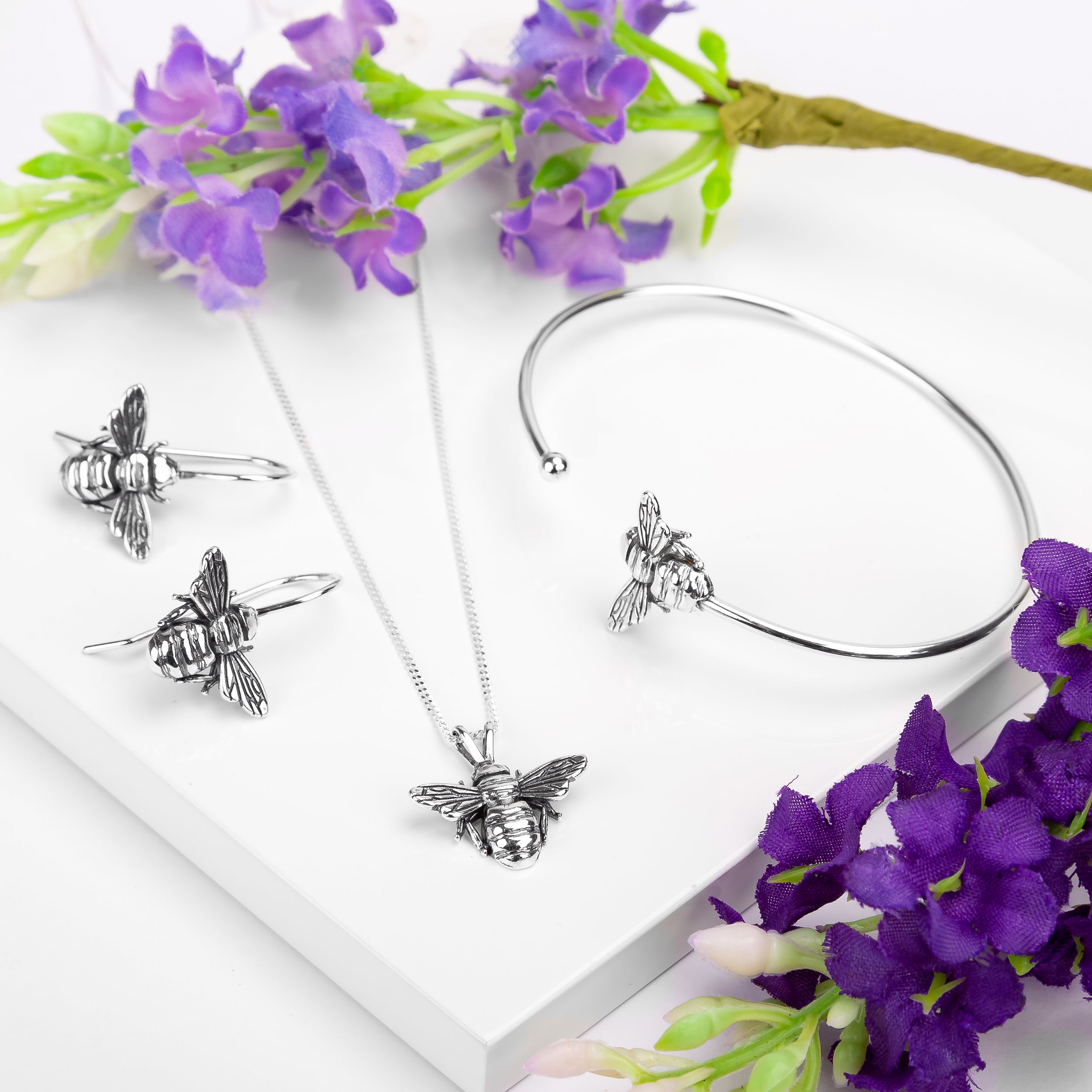 Handcrafted in 925 silver, this whimsical Bee Bangle is full of detail and charm. With textured wings and body, it really brings it to life. The bangle itself is an easy open slip on style which can be adjusted to fit and is comfortable to wear. Cleverly handmade, this bangle will always look pristine and keep its shape.