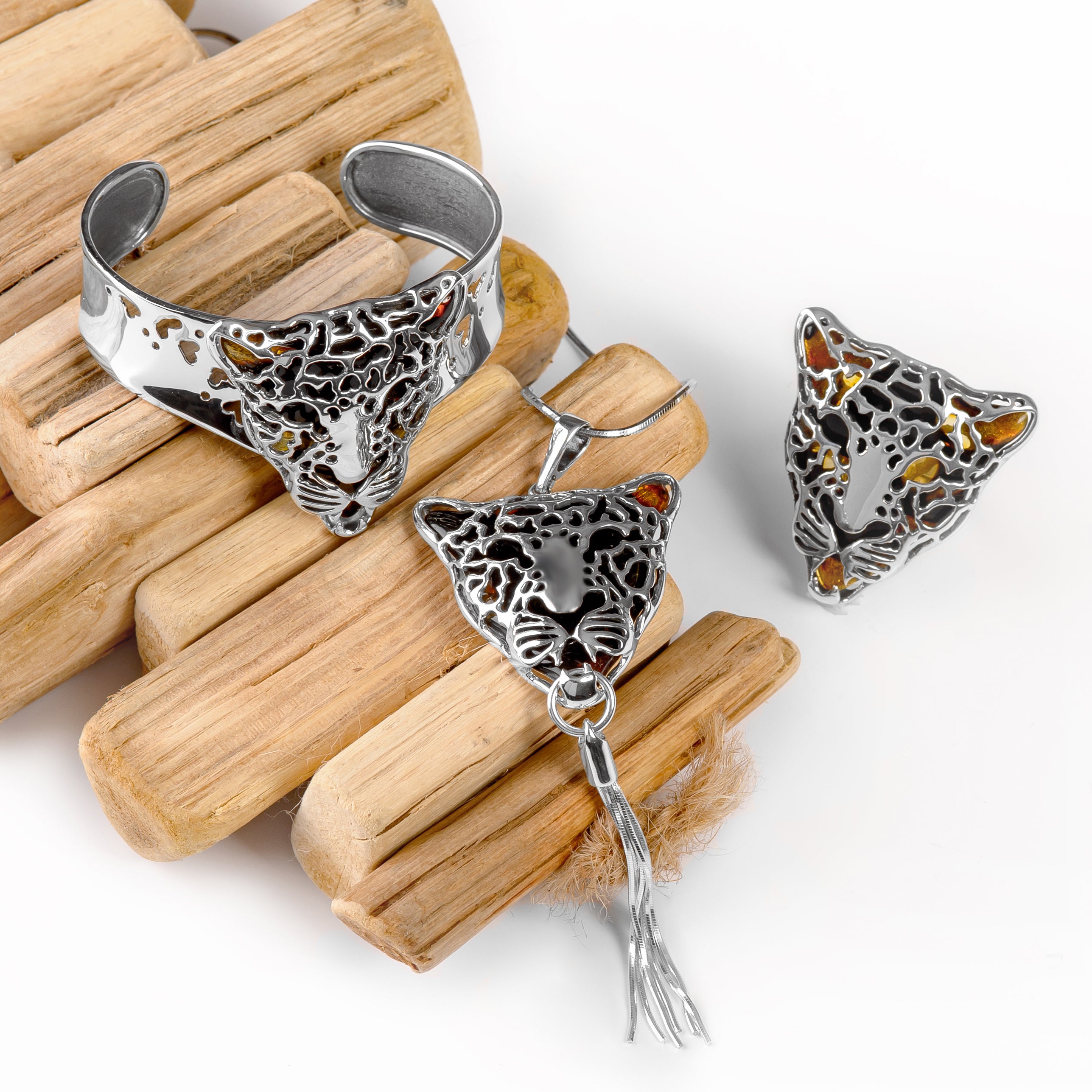 Handcrafted in solid 925 silver, this unique cuff is adorned with a Leopard Head set centrally on top of the bangle. With a genuine Baltic Amber gemstone encased within the head, the stunning silver work captures the essence and colour of their golden, spotted bodies.