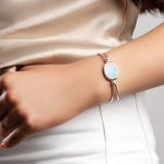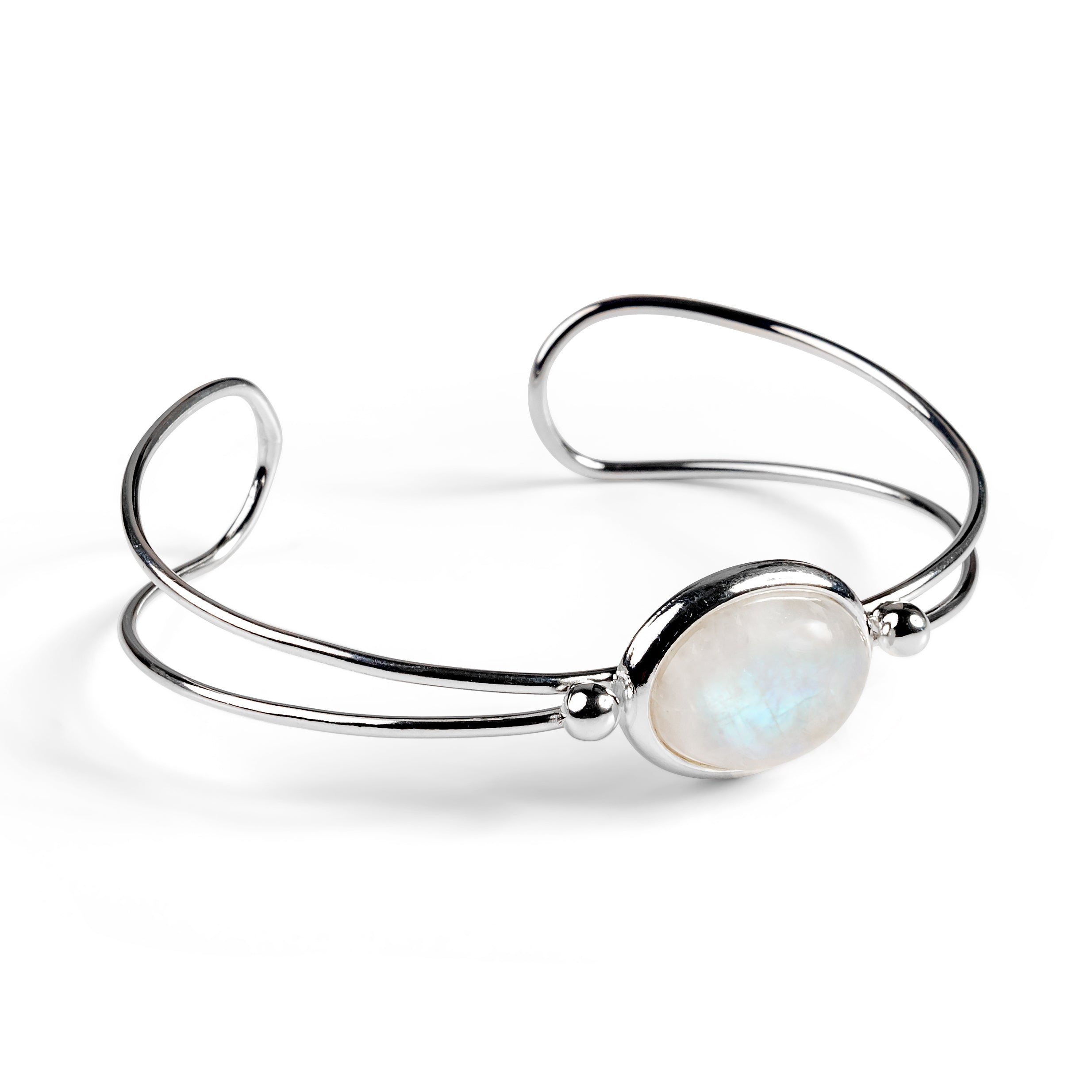 Crafted in 925 solid silver open torque bangle with a single natural Moonstone gemstone set in the centre. Easy to adjust to fit comfortably on the wrist.