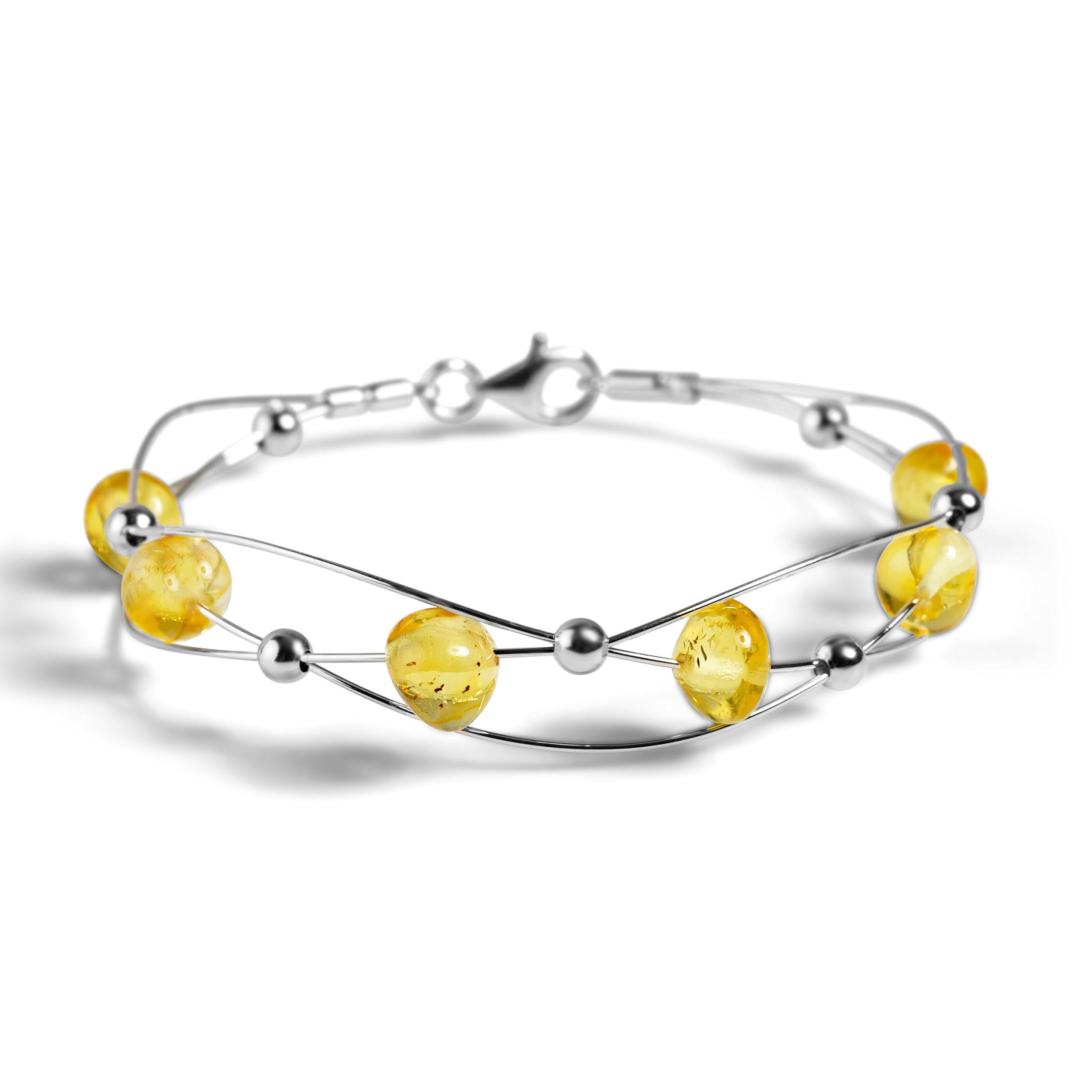 Carefully handcrafted in 925 silver and adorned with genuine Baltic Yellow Amber gemstones spaced evenly across entwined silver wire. Finished with miniature silver silver between each of the stones. Complete with a bolt ring clasp for secure and easy fastening.