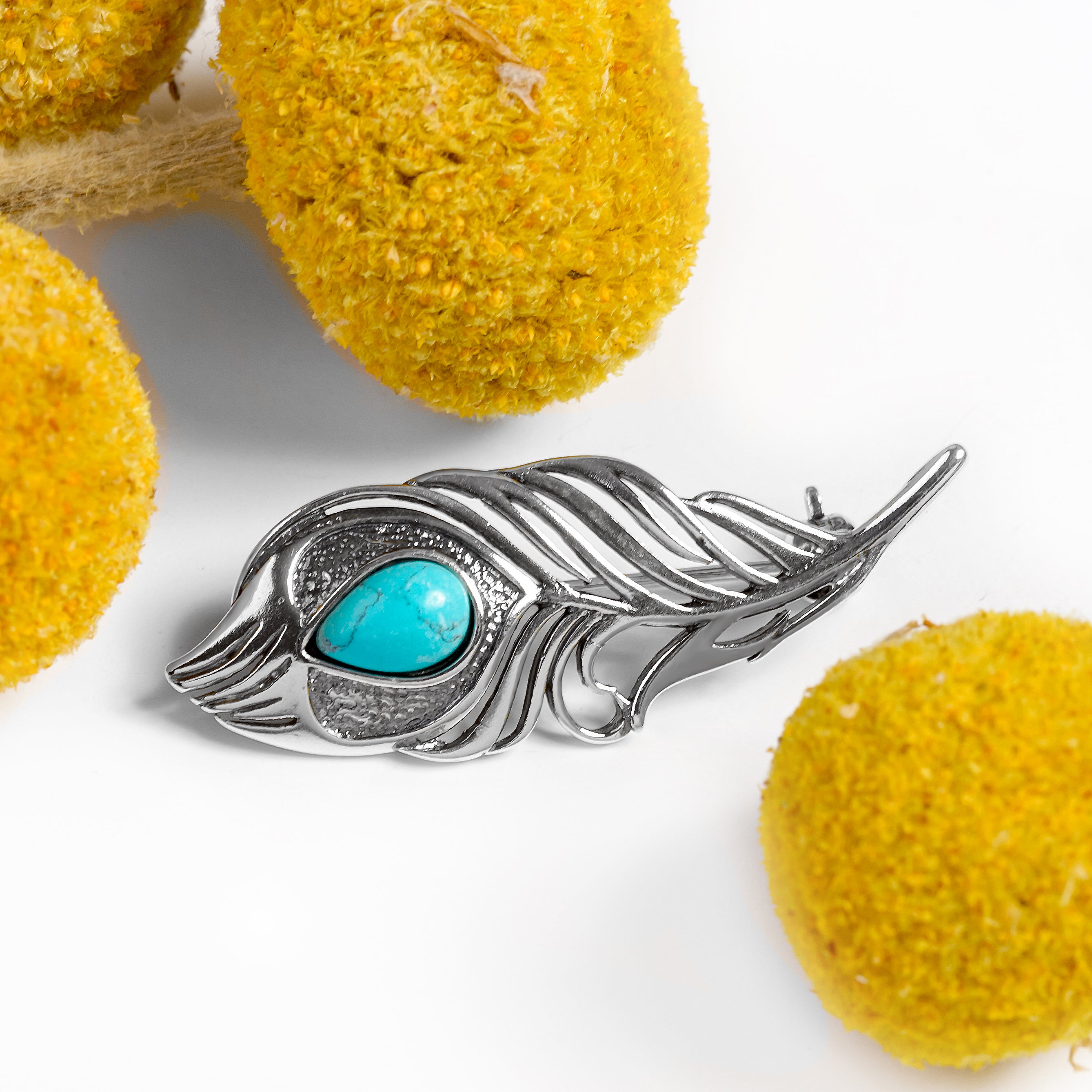 Add a touch of elegance to your outfit with our Silver and Turquoise Peacock Feather Brooch.