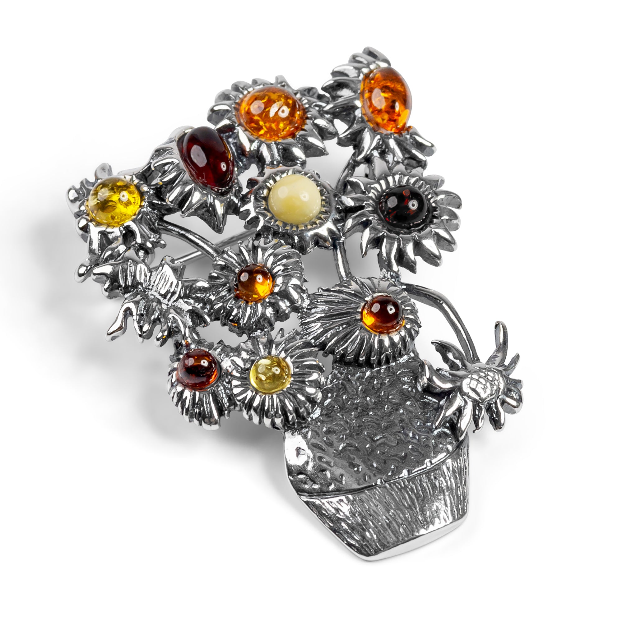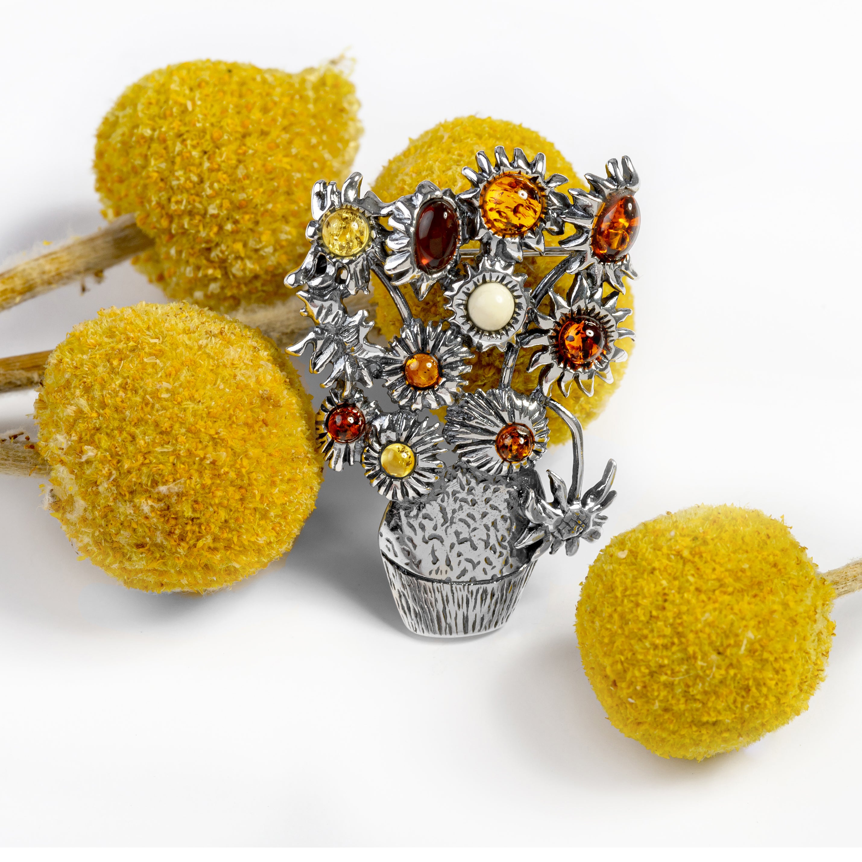 Sunflowers Brooch Inspired by Van Gogh in Silver and Amber