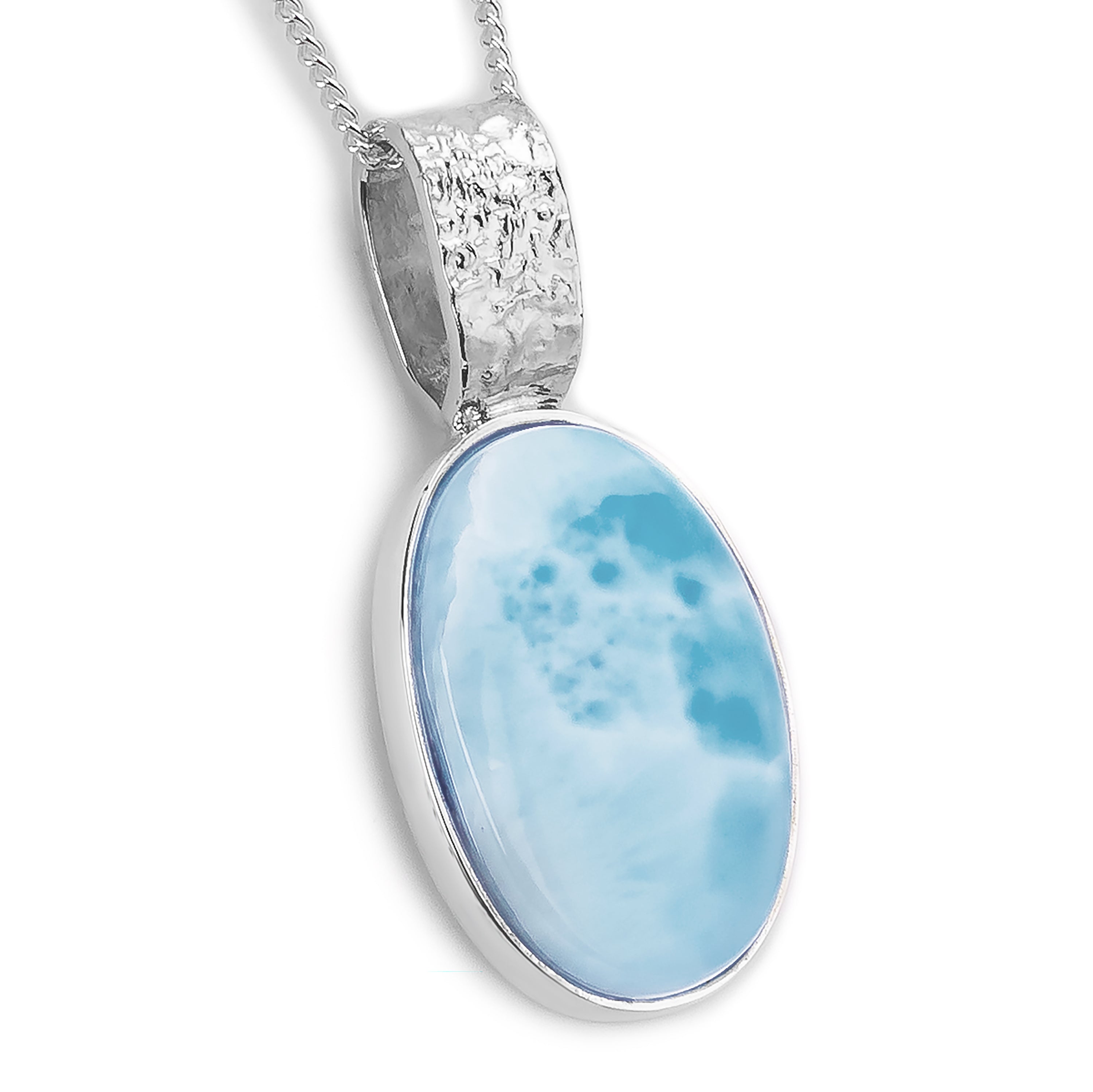 Expertly handcrafted in 925 Sterling Silver, it showcases a natural, light blue Larimar gemstone carved into a delicate oval shape, nestled within a sleek, smooth silver mount finished with highly decorative bale.