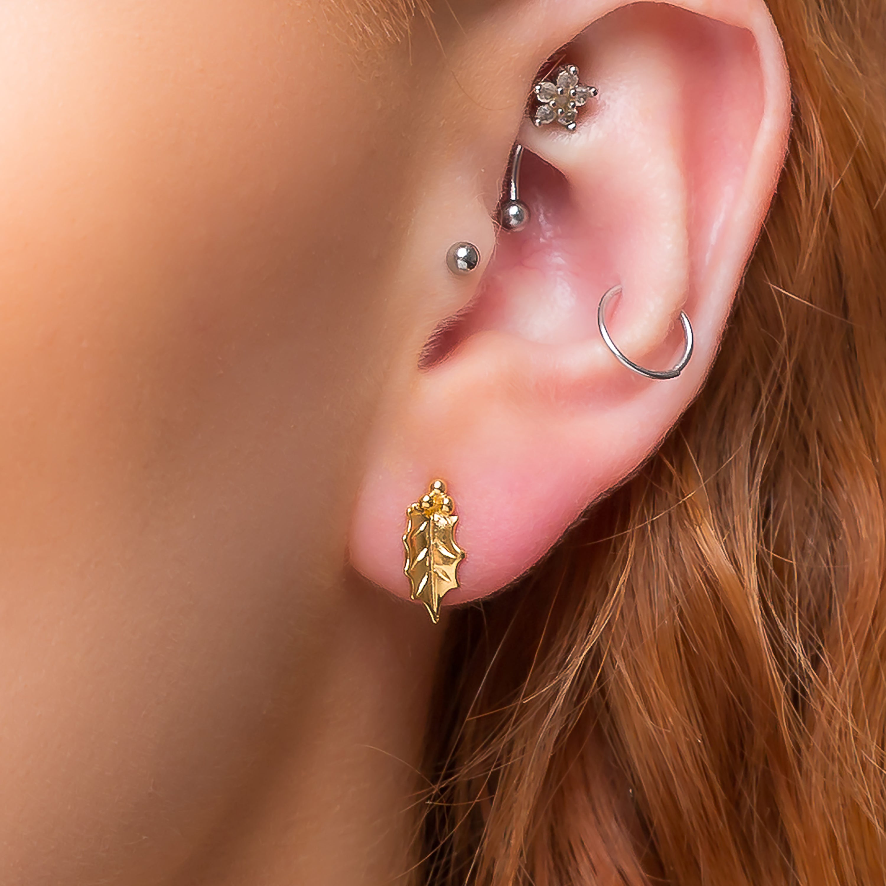 Holly Leaf Stud Earrings in Silver with 24ct Gold