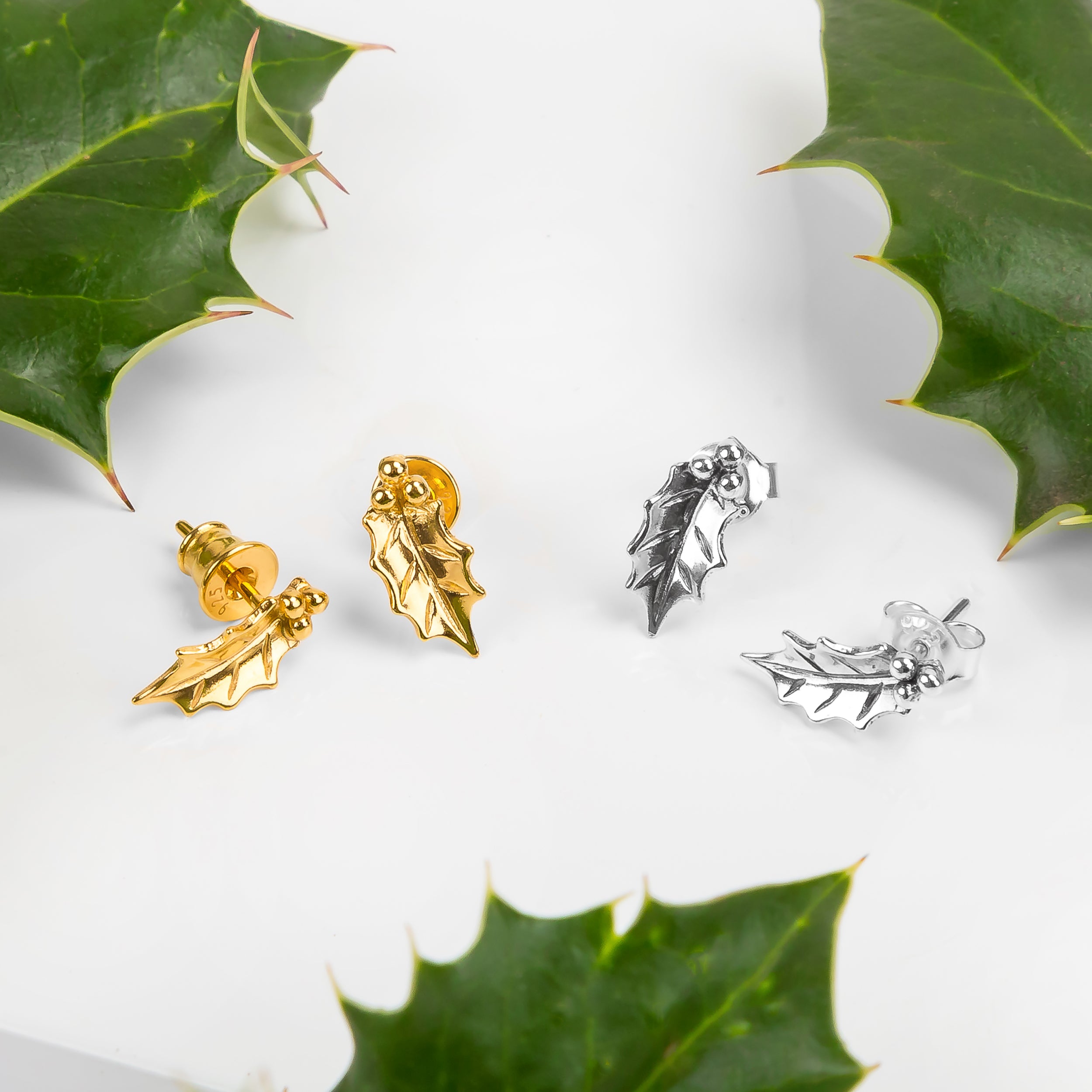 Handcrafted in 925 Sterling Silver with 24ct Gold, each earring is highly detailed with 3 tiny berries, etching on the leaves and finished in the famous spikey leaf shape. Complete with a solid silver stem and butterfly back, they are perfect for all ages!