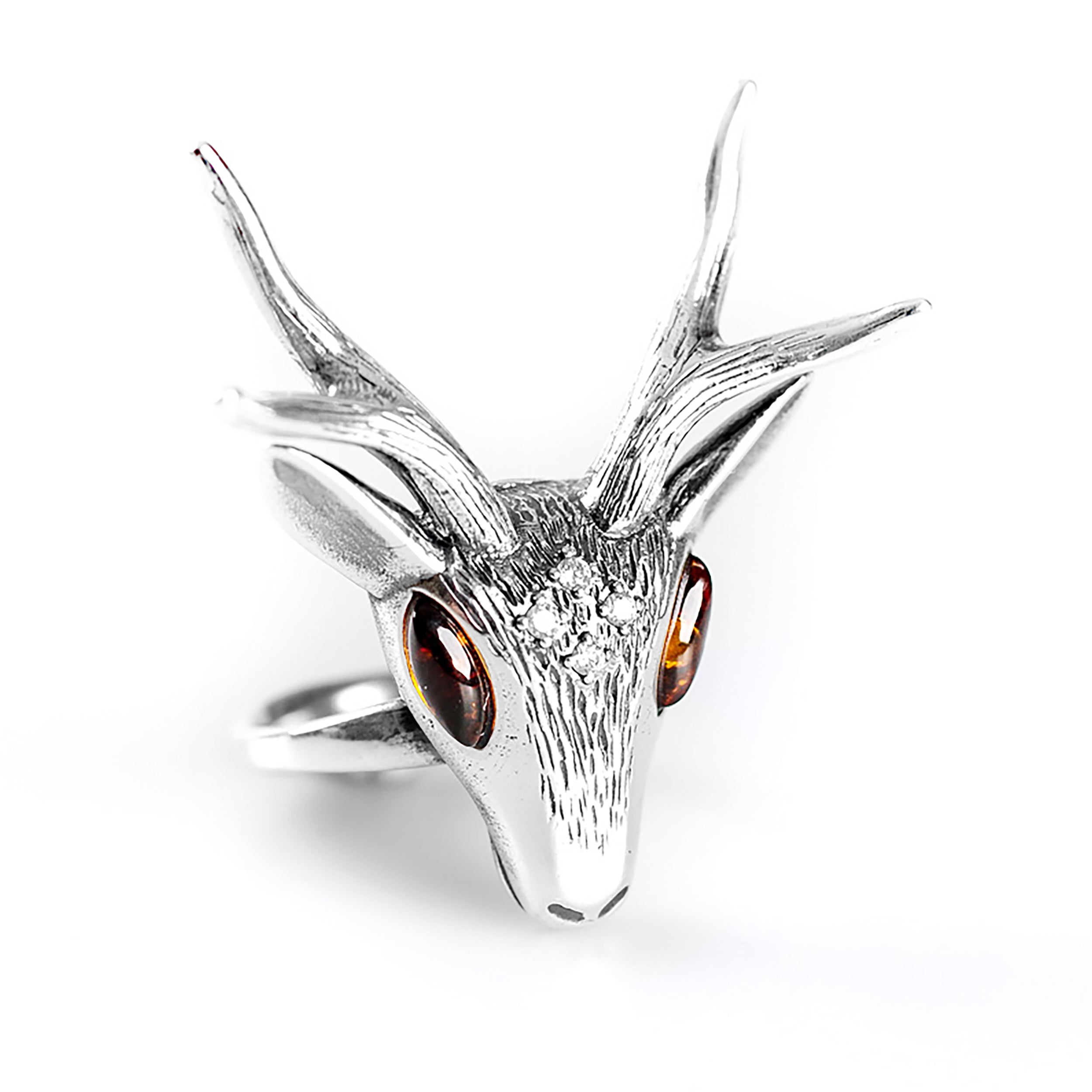 Large Stag Head Ring in Silver and Amber