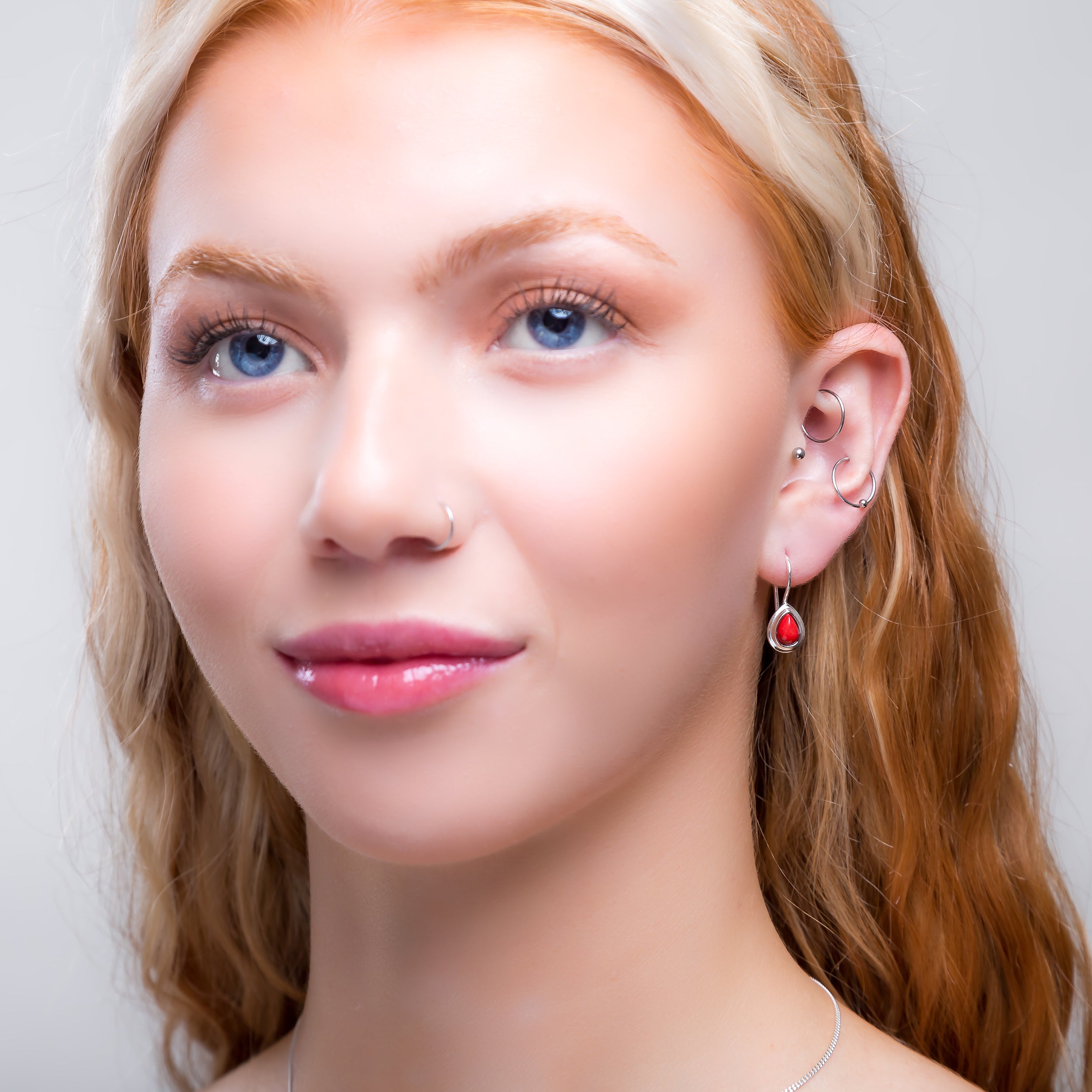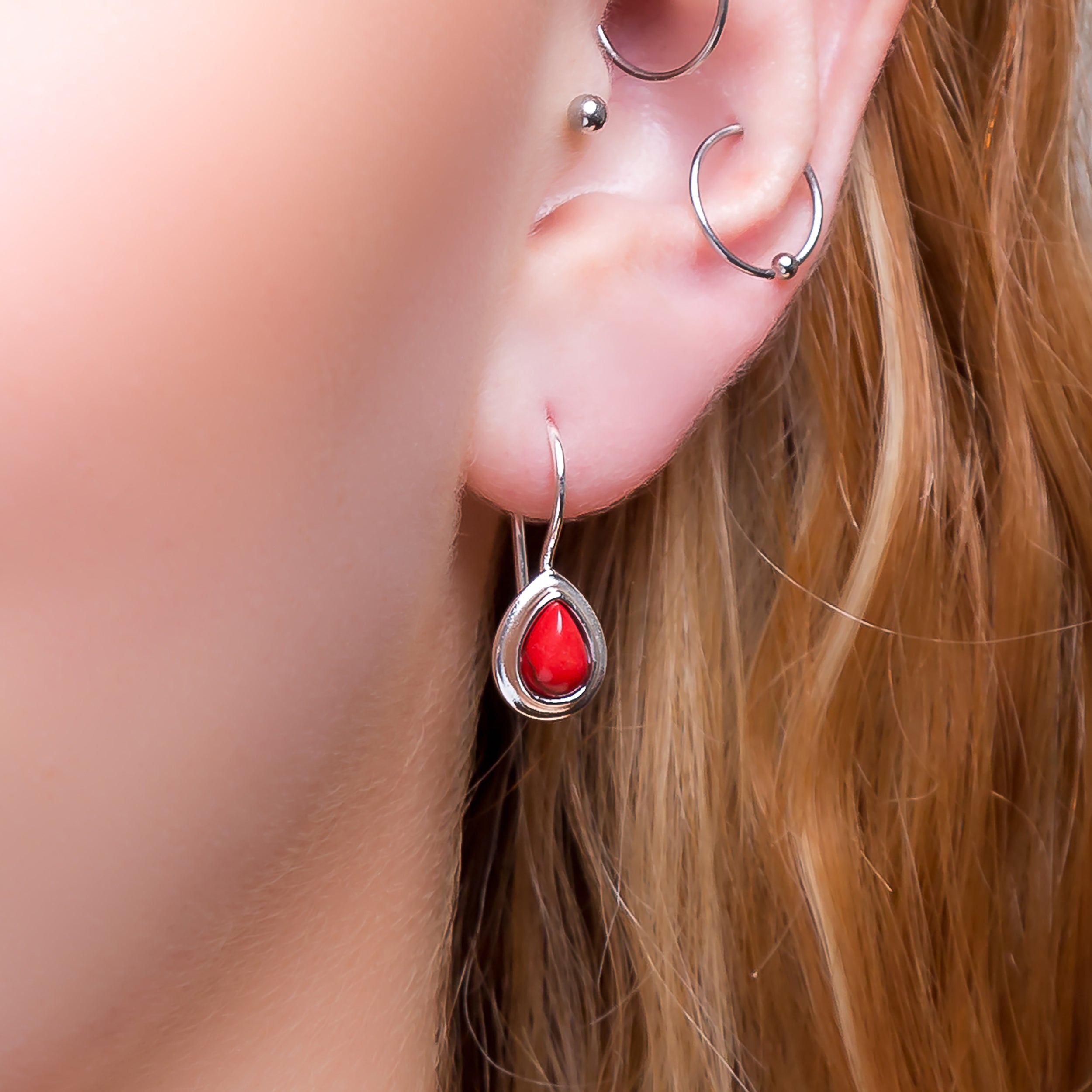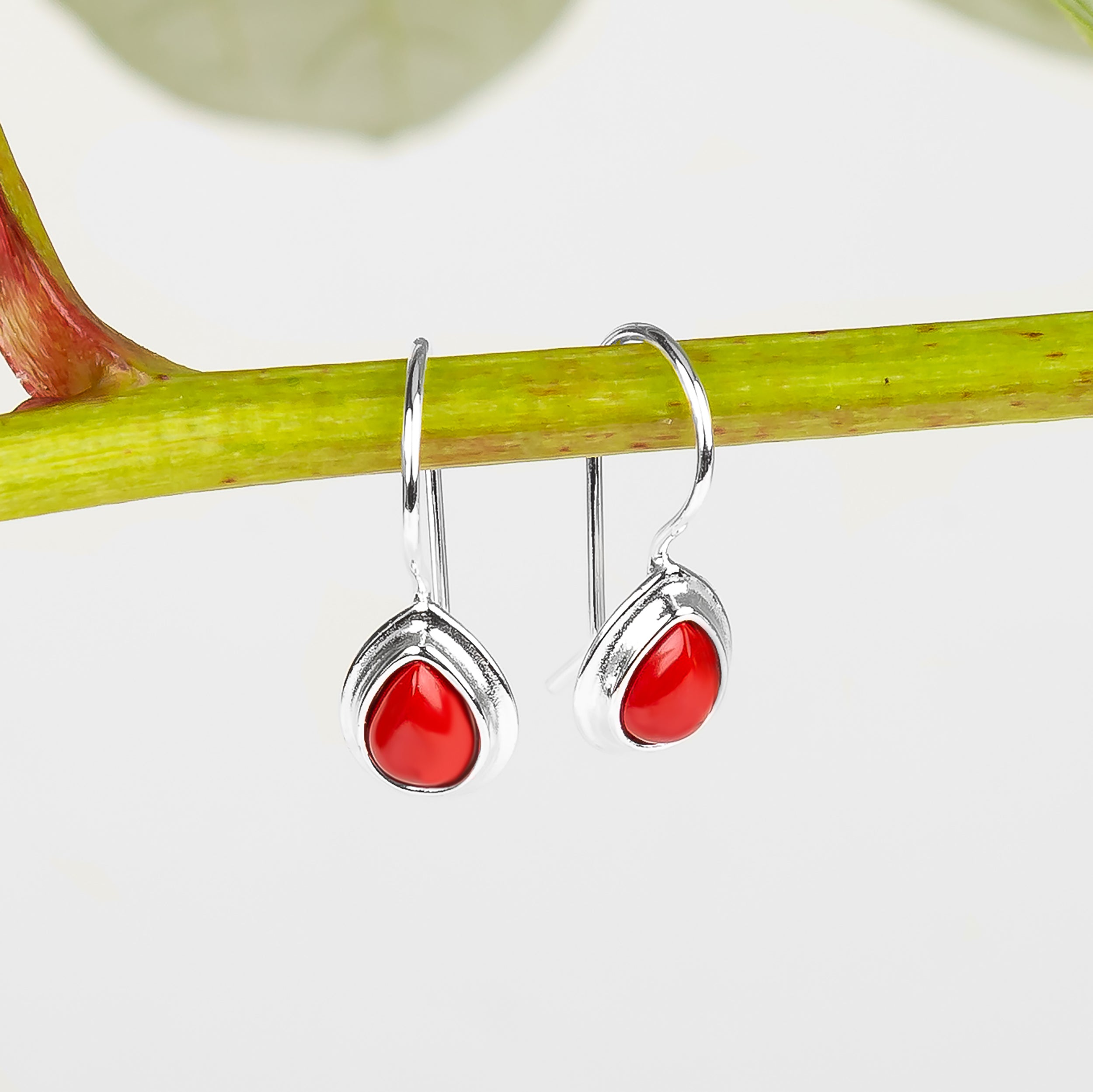 Crafted in solid 925 silver, each earring has a single teardrop shaped red Coral stone. With a solid silver open hook and delicate design, these earrings are ideal for all day wearing.