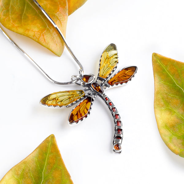 Handcrafted in 925 silver, this unique jewellery piece has genuine Baltic Amber gemstone wings and a red Coral stone curved tail. With open silver work wings, we can see the detail through the almost translucent amber stones which really brings it to life. Complete with a solid silver chain, it will adorn your neckline proudly.