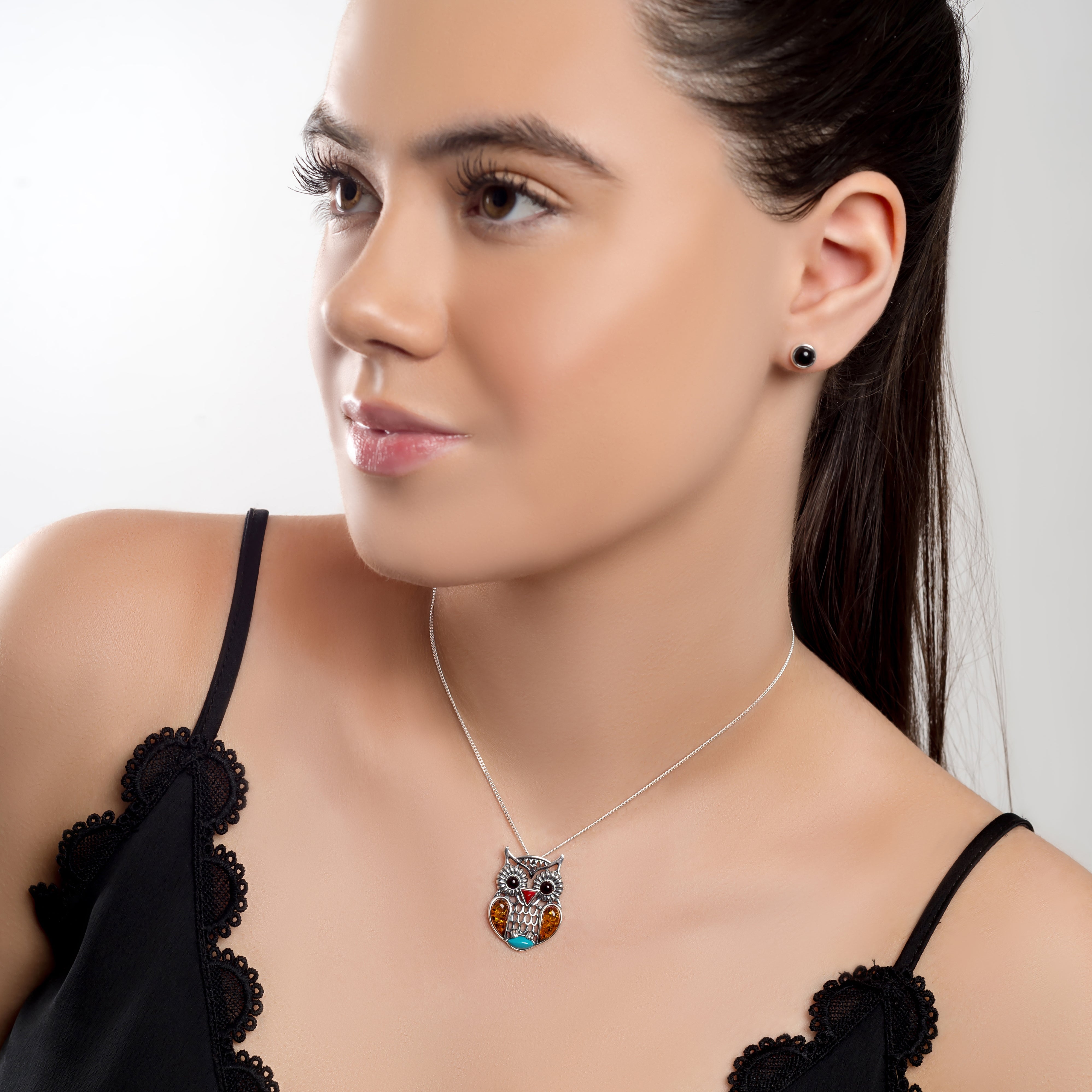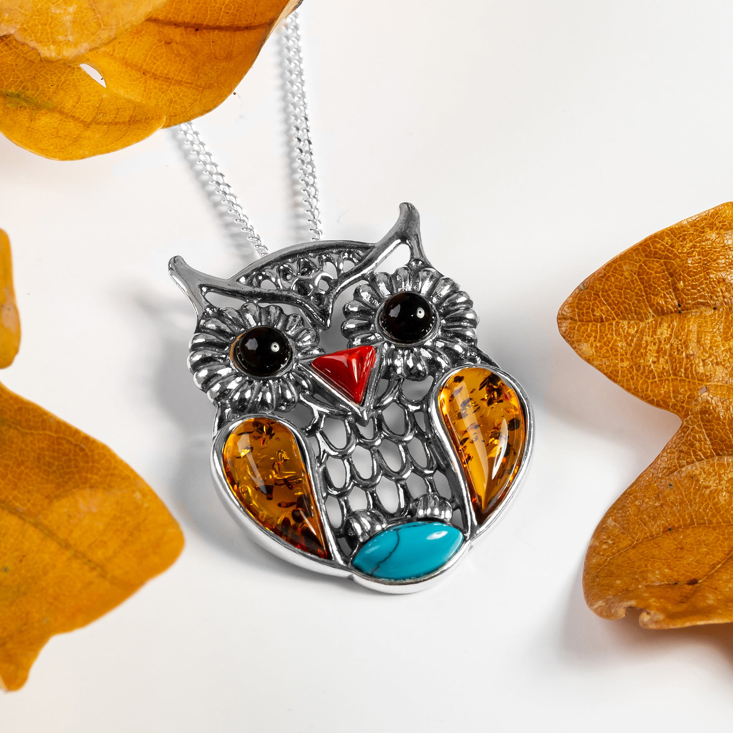 Brighten up your jewellery collection with our Silver, Turquoise and Amber Feathered Owl Necklace.