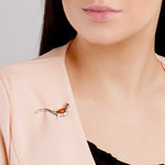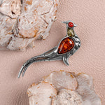 Pheasant Bird Brooch in Silver, Coral and Amber