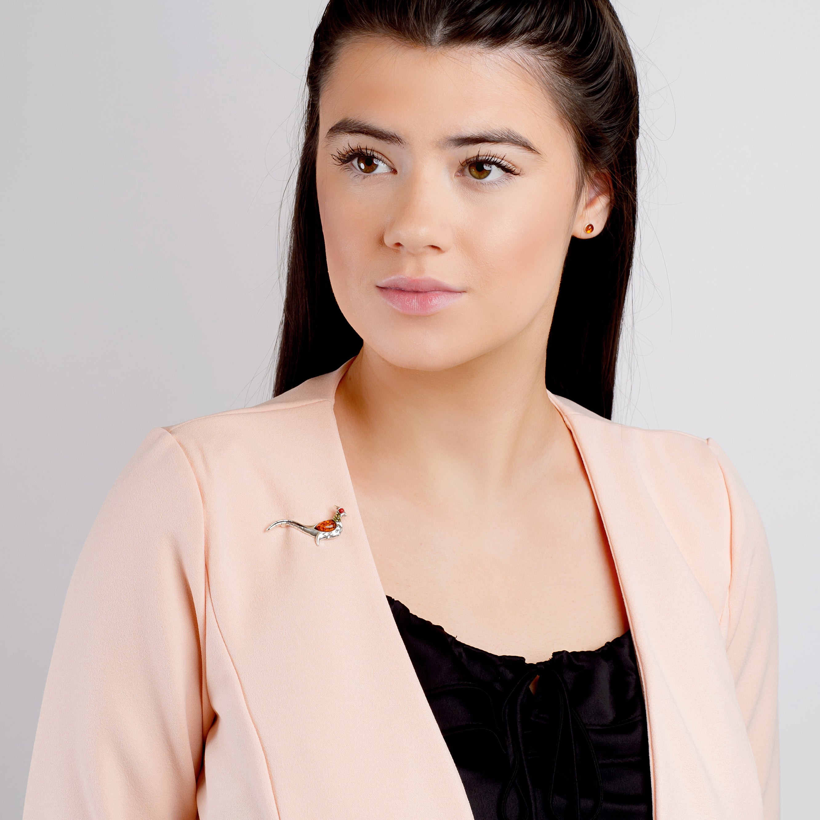 Handcrafted in 925 Sterling Silver this brooch is embellished with genuine Baltic Amber gemstones for the copper plumage and green amber ringneck. Finished with the a vibrant red Coral head and silver detailed tail feathers. Complete with a solid silver pin and safety clasp so it can be worn with pride and confidence.
