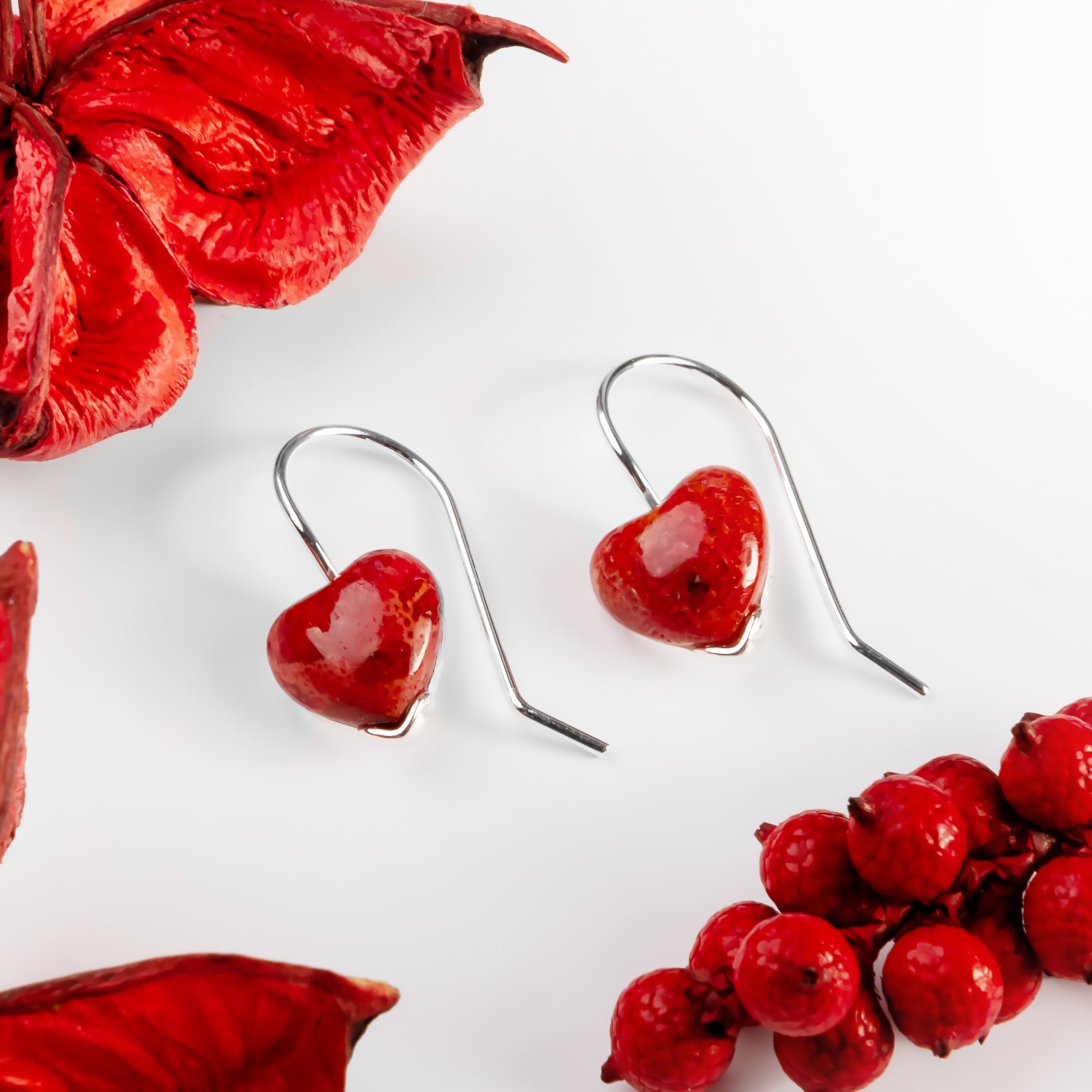 Celebrate your love with our Silver and Red Horn Coral Heart Shaped Drop Earrings.