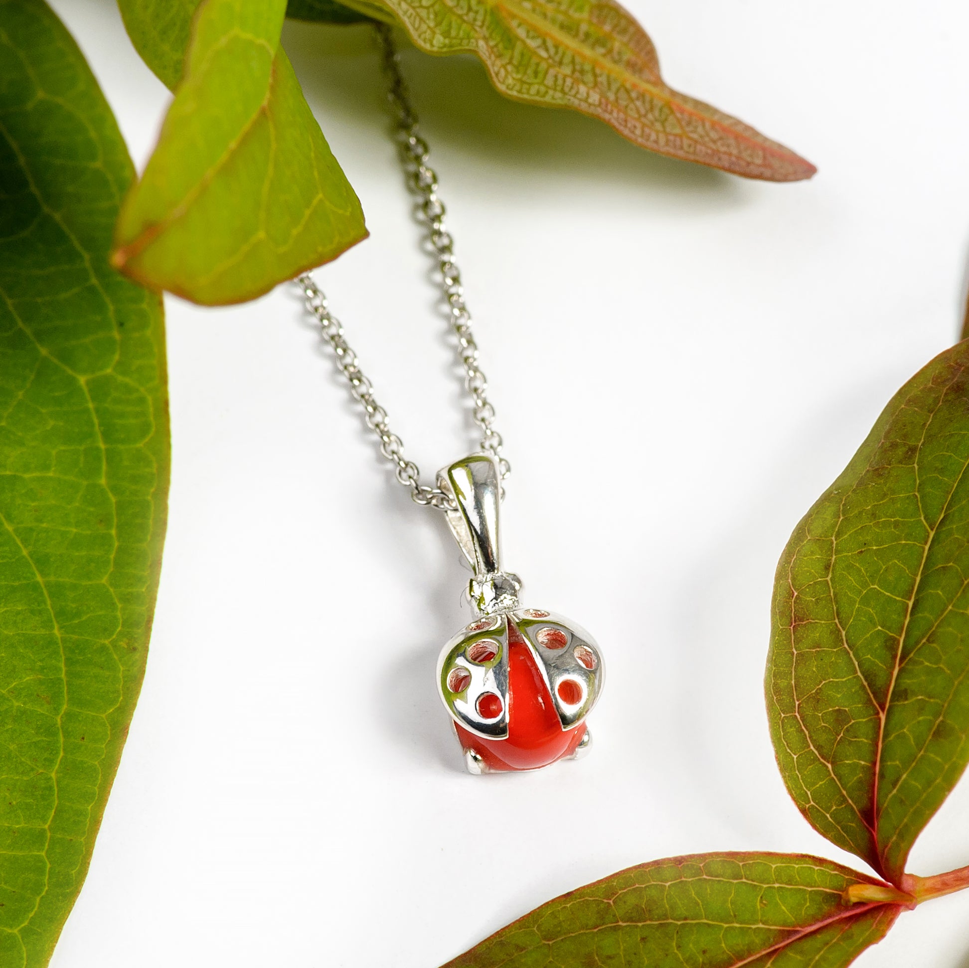 Adorable Silver and Coral Ladybird Necklace is perfect for your love bug.