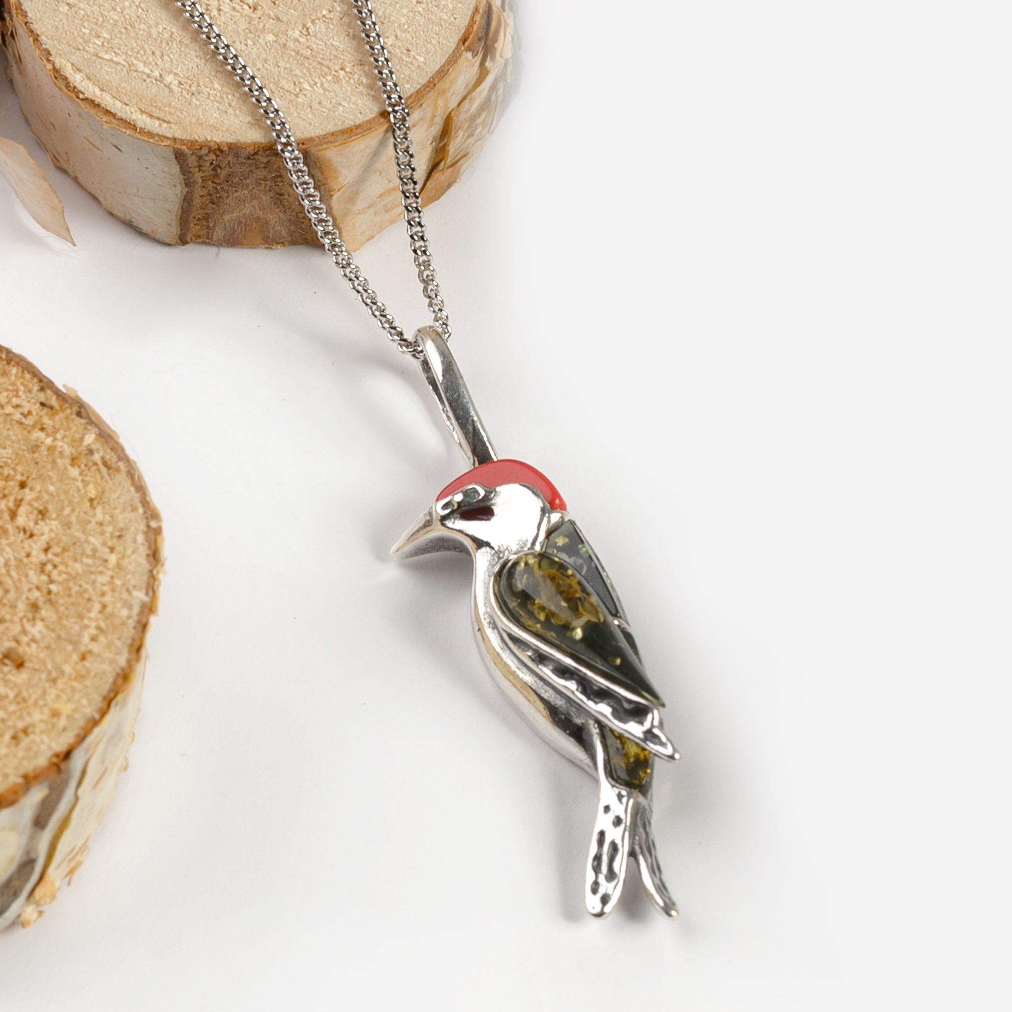 Miniature Green Woodpecker Bird Necklace in Silver, Coral and Amber