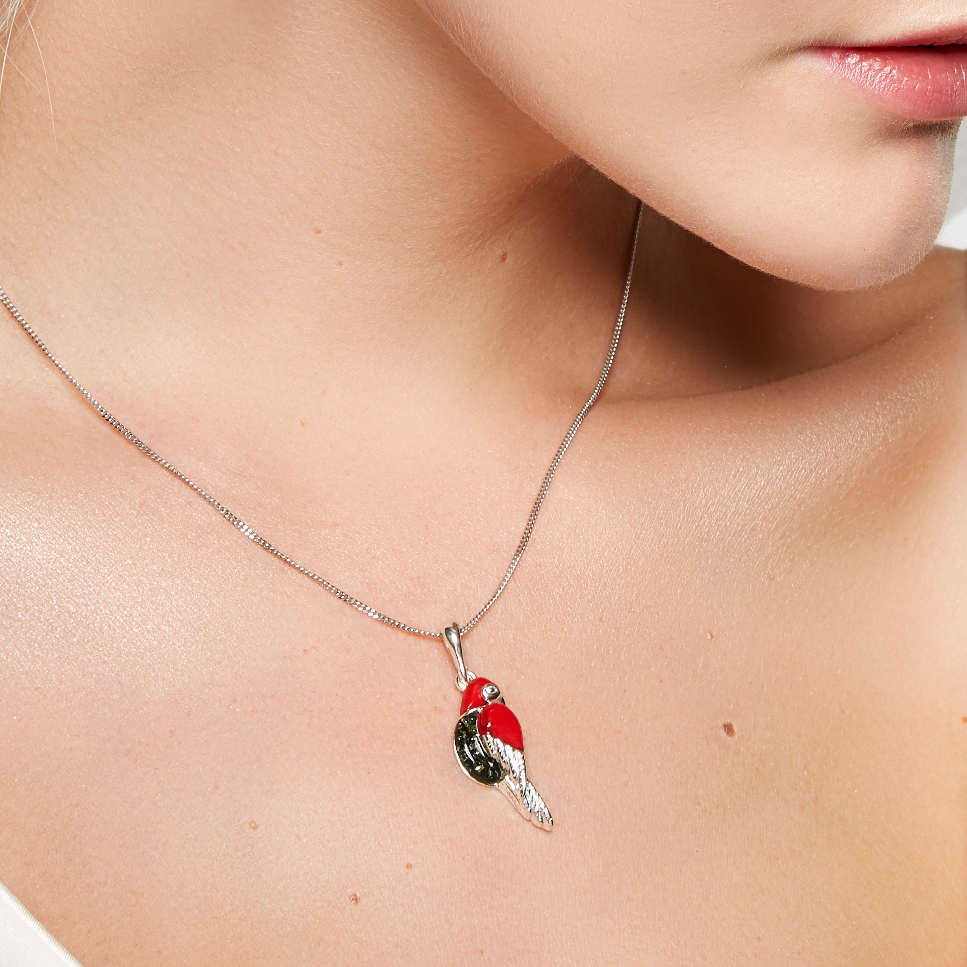 Handcrafted in 925, this necklace is adorned with a genuine Baltic Green Amber gemstone body and bright red Coral stone wings. With a detailed silver beak, it is a lovely tribute to these comical birds. Complete with a silver chain, it will add a splash of colour to your accessories.