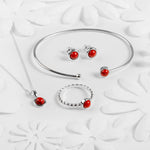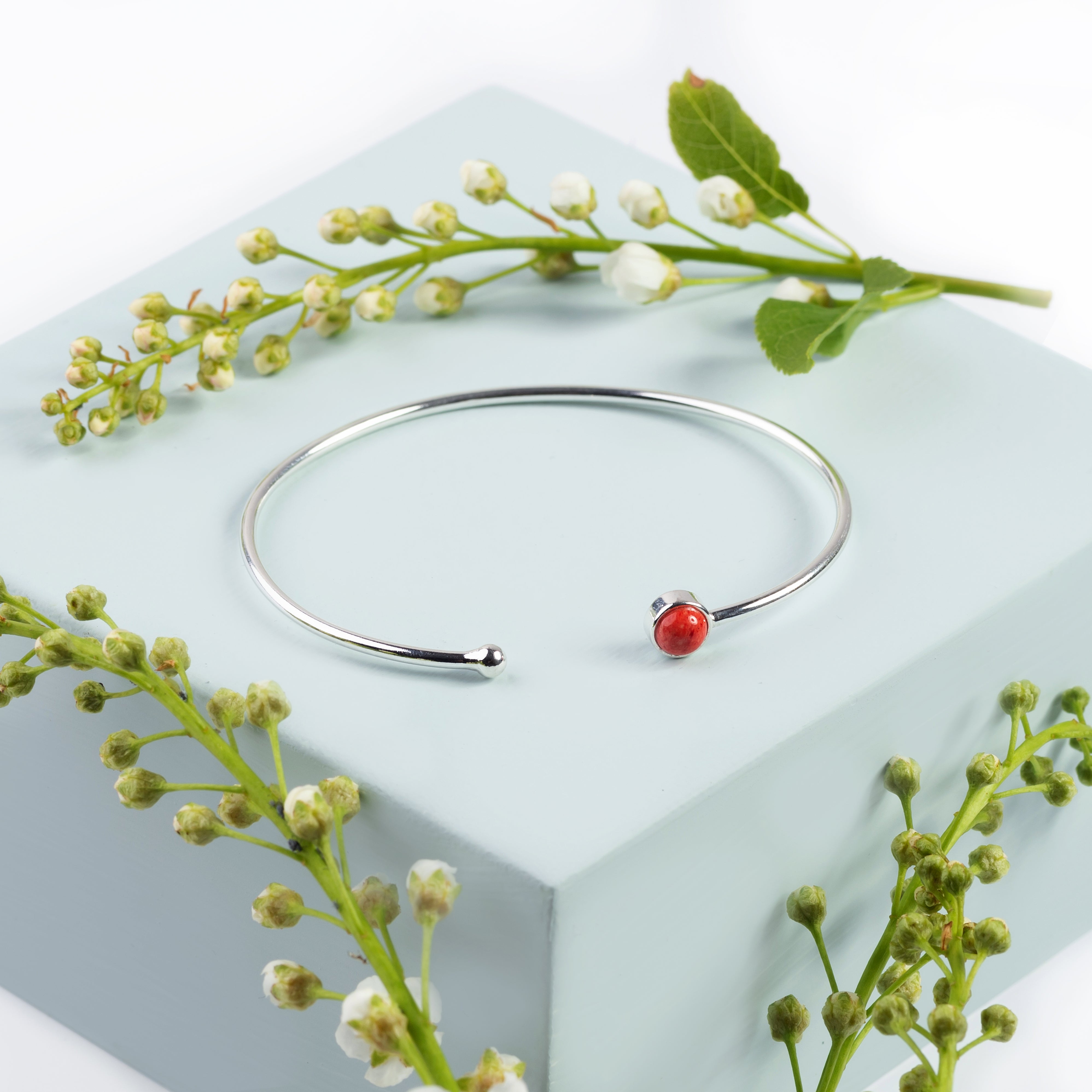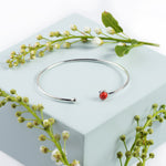 Handcrafted in 925 Sterling Silver, this solid cuff bangle is adorned with a single round vibrant Red Coral stone at one end and a fixed silver ball at the other. With an easy open slip on style which can be adjusted to fit, it is comfortable and secure to wear. Cleverly handmade, this bangle will always look pristine and keep its shape.