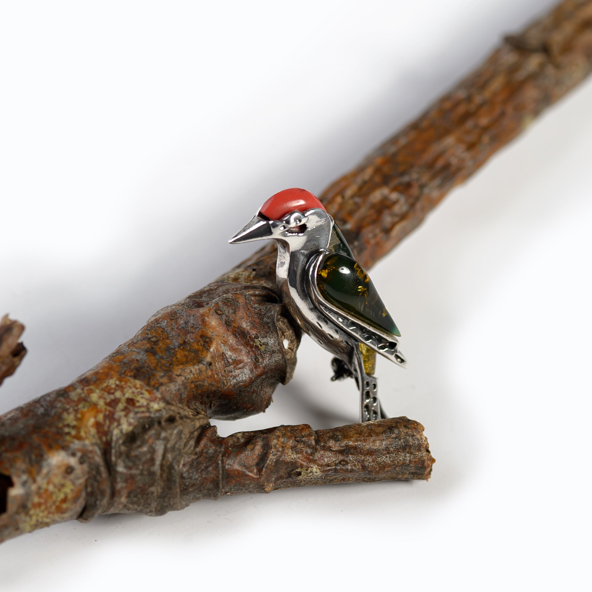 Small Green Woodpecker Bird Brooch in Silver, Coral and Amber