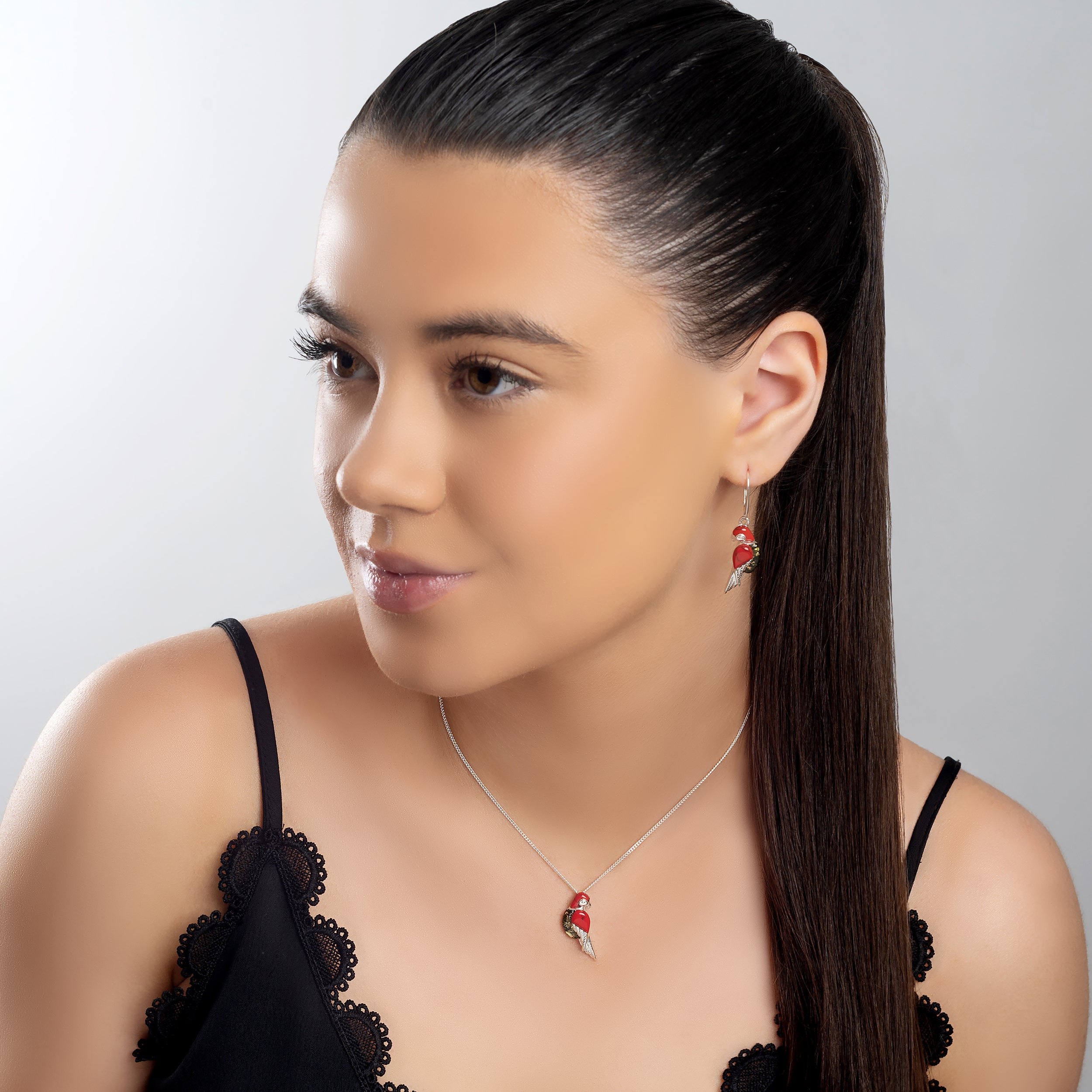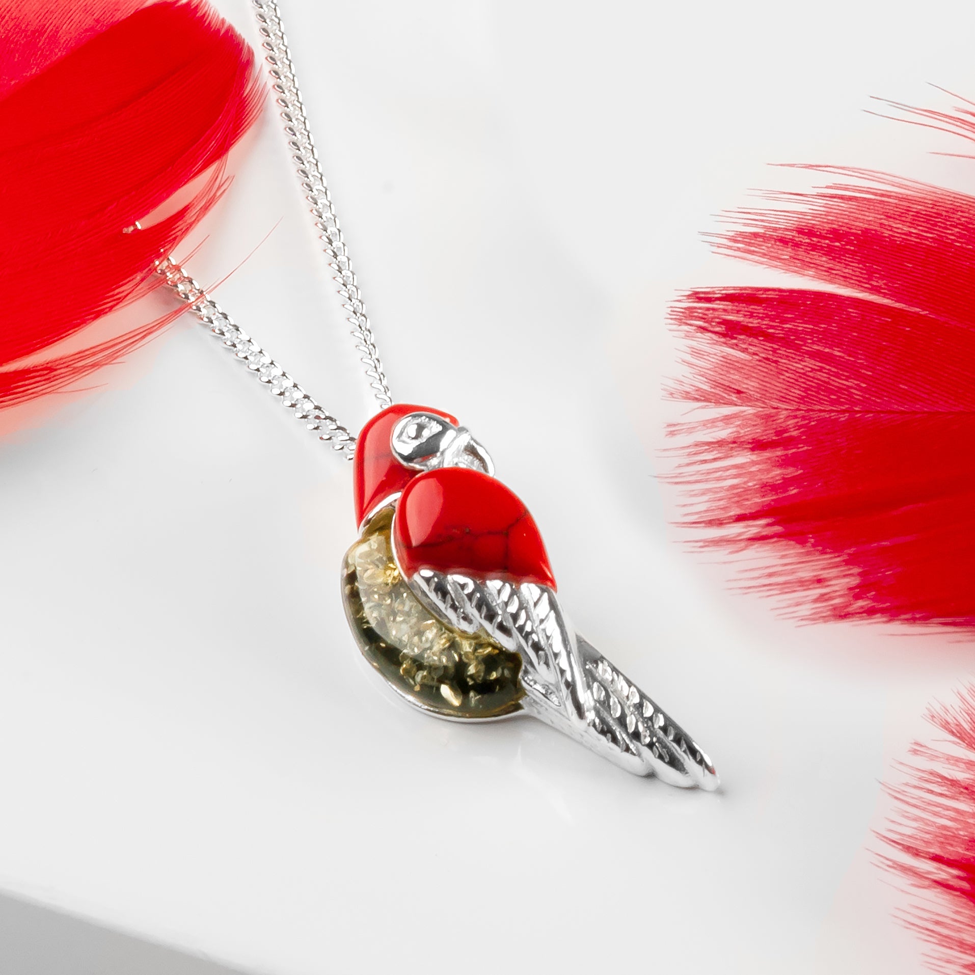 Handcrafted in 925, this necklace is adorned with a genuine Baltic Green Amber gemstone body and bright red Coral stone wings. With a detailed silver beak, it is a lovely tribute to these comical birds. Complete with a silver chain, it will add a splash of colour to your accessories.
