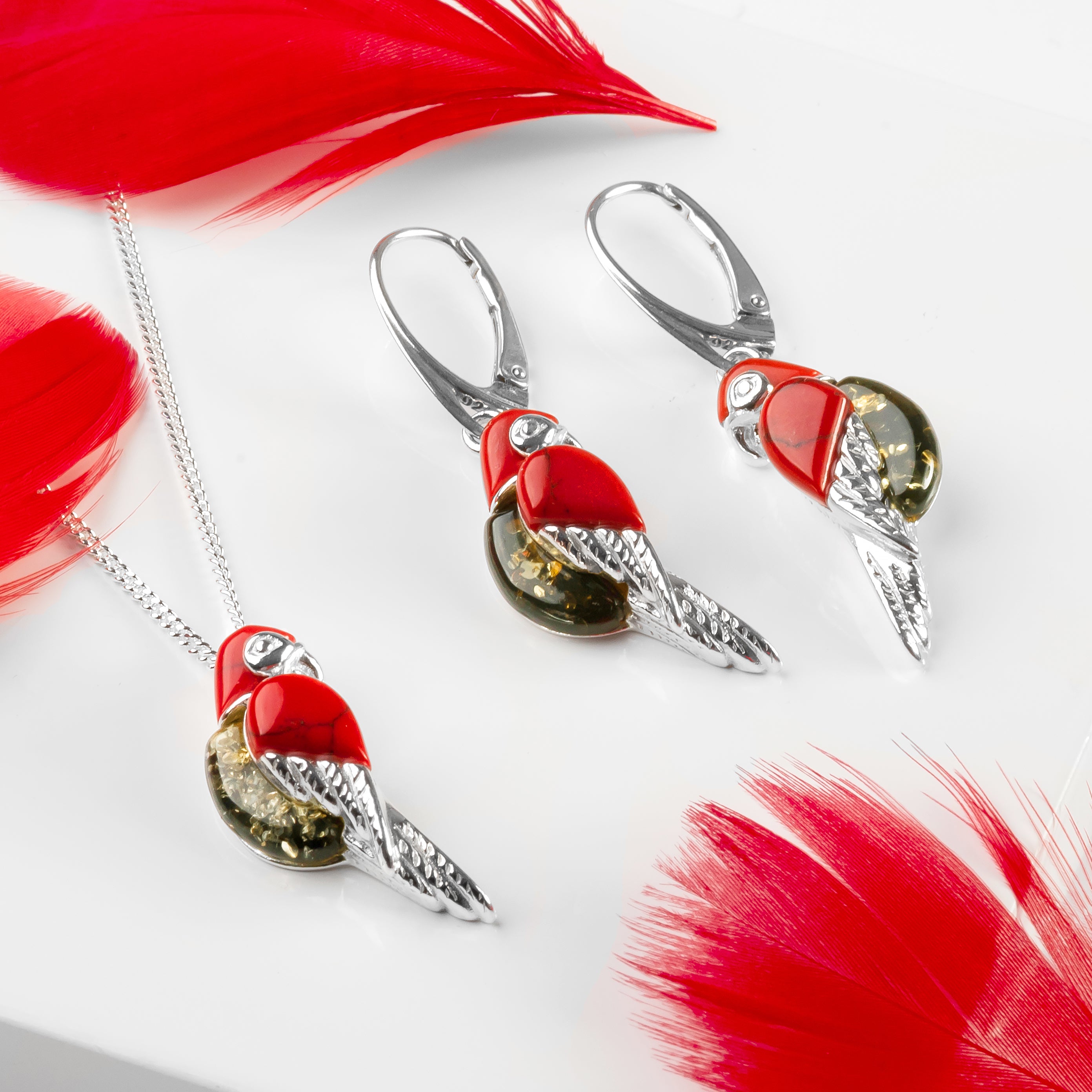 Tropical Macaw Parrot Necklace in Silver, Coral and Green Amber