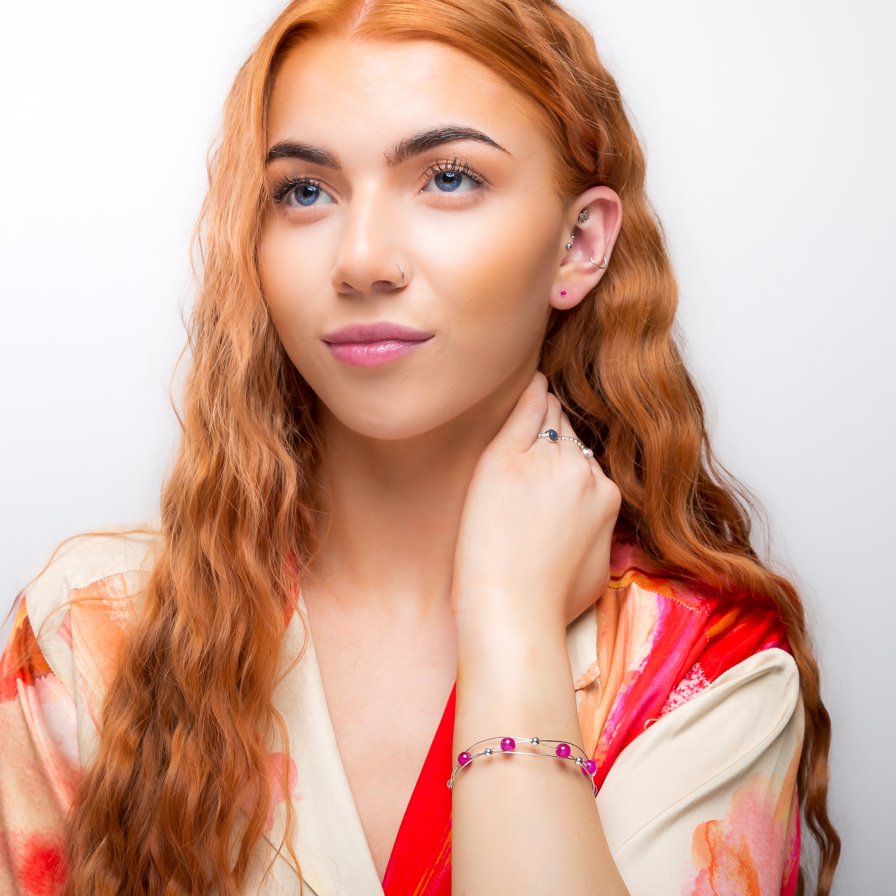 Carefully handcrafted in 925 silver and adorned with bright Ruby stones spaced evenly across entwined silver wire. Finished with miniature silver beads between each of the stones. Complete with a bolt ring clasp for secure and easy fastening.