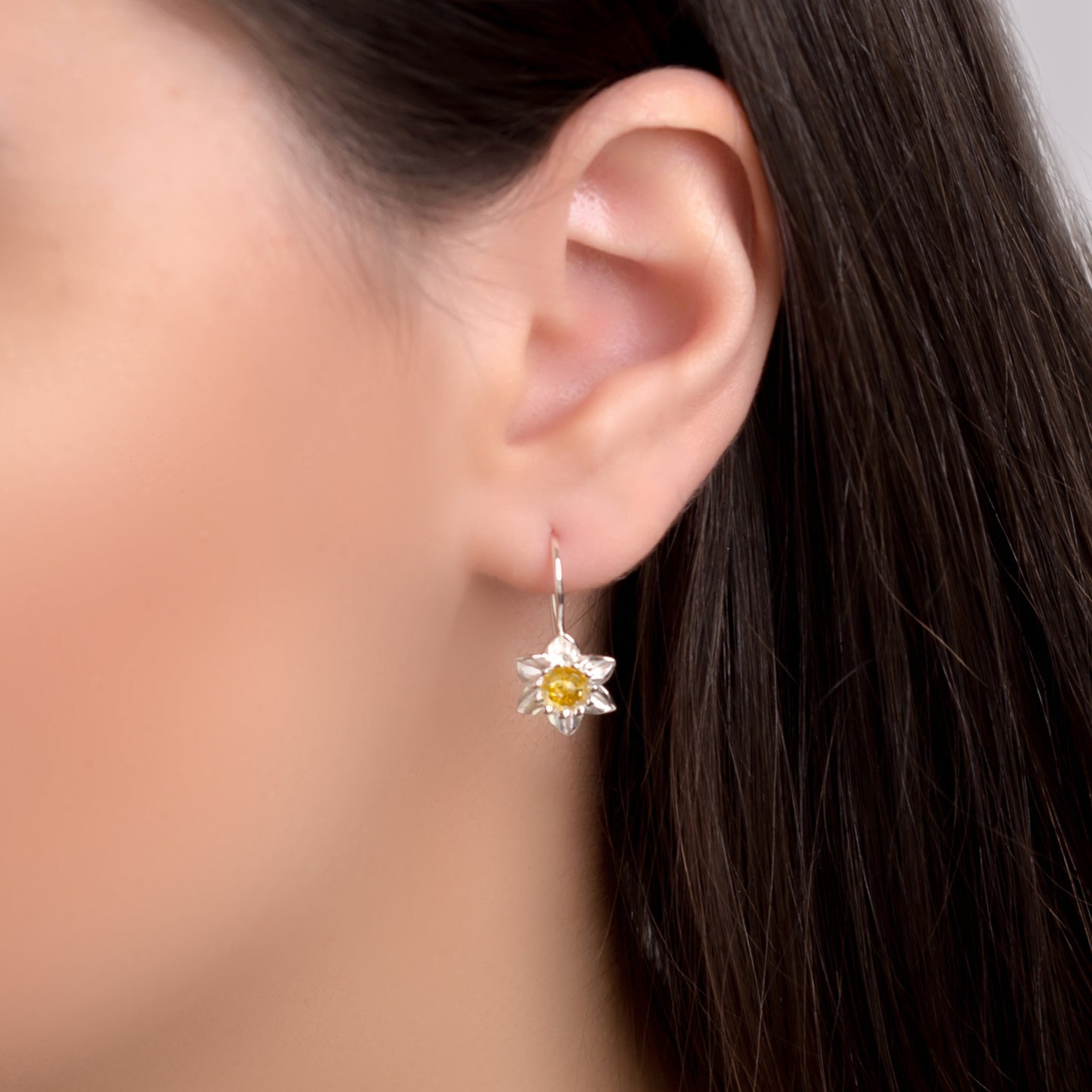 Representing the beginning on spring time, our Silver and Amber Daffodil Hook Earrings will be sure to brighten up any outfit.