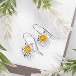 Daffodil Flower Hook Earrings in Silver and Yellow Amber