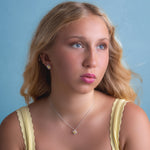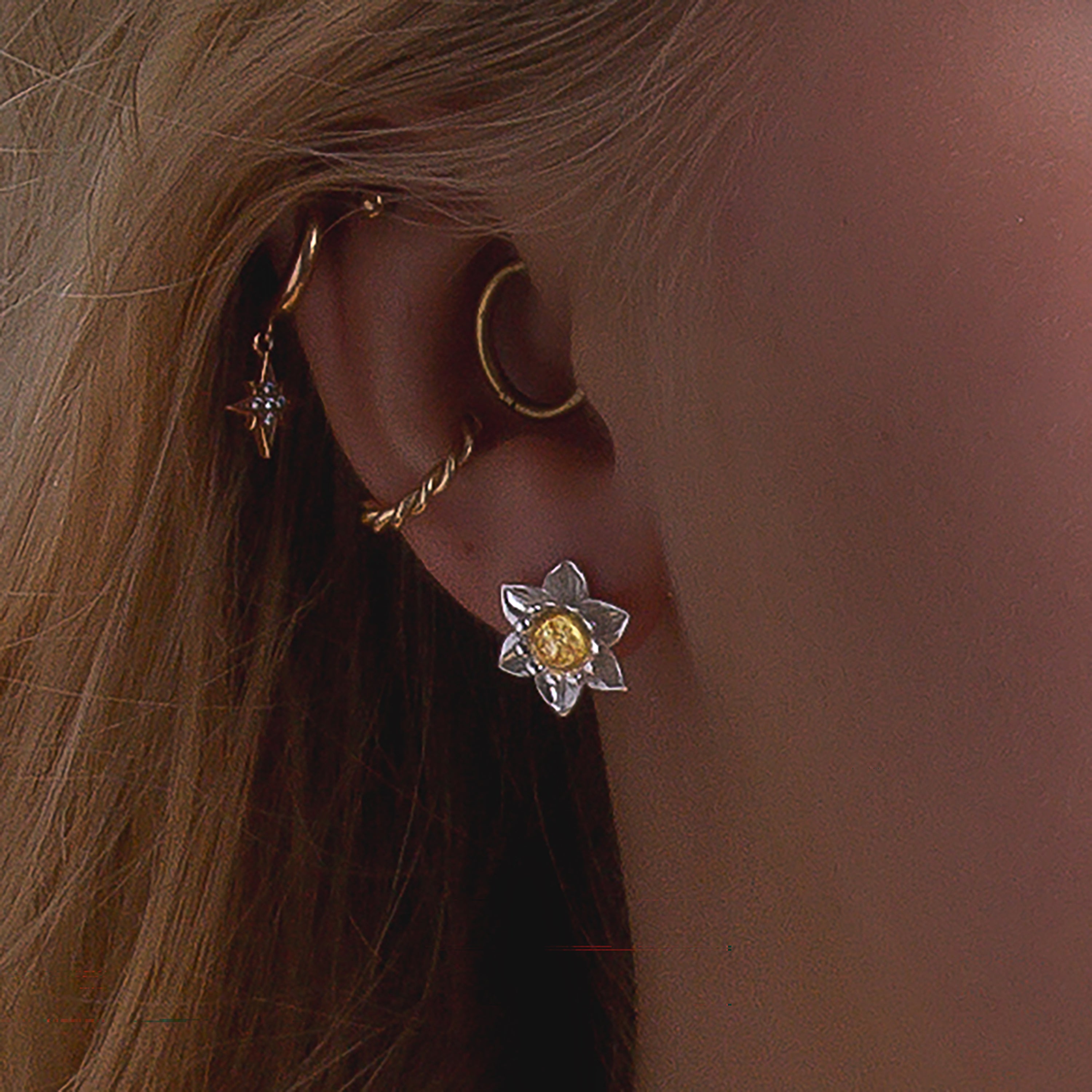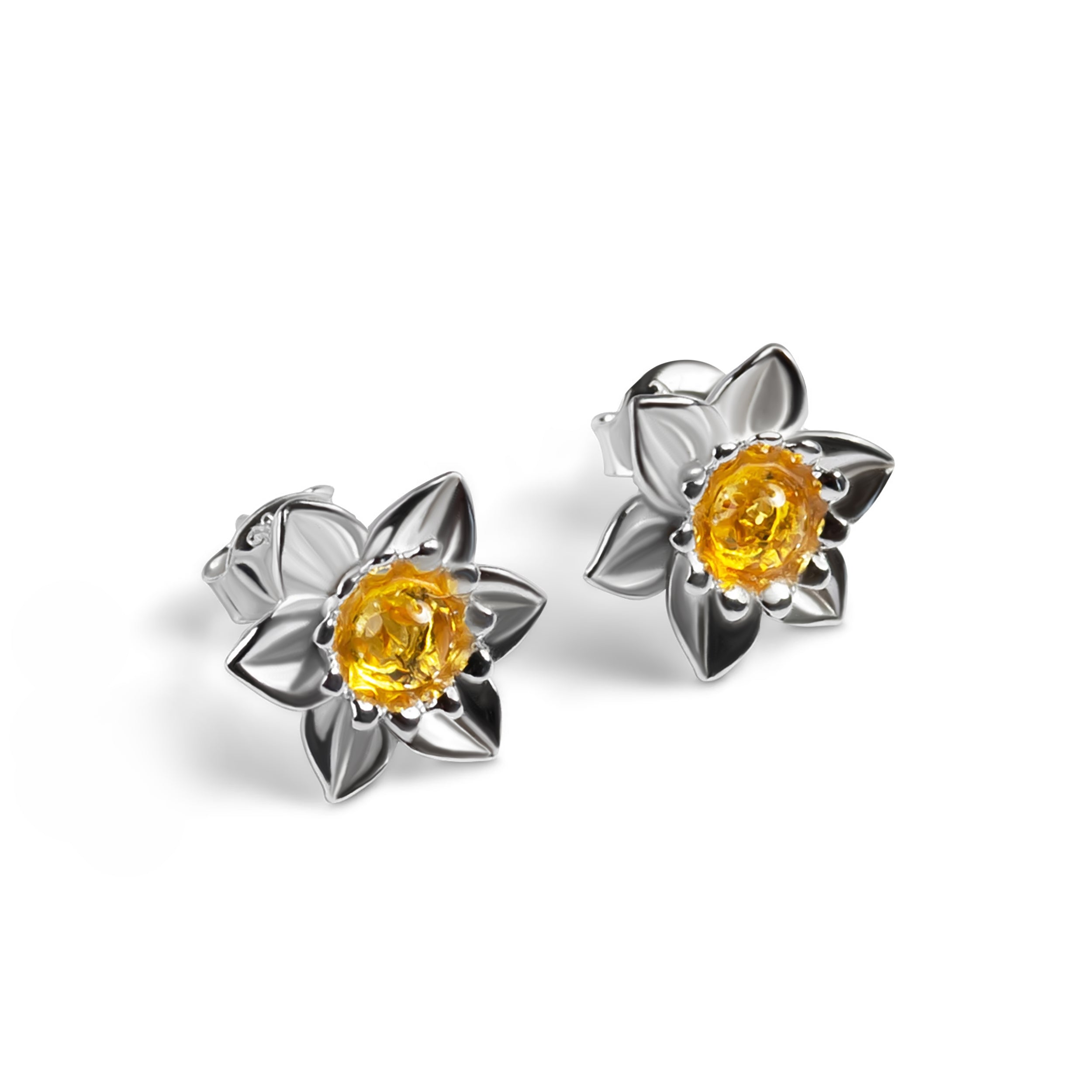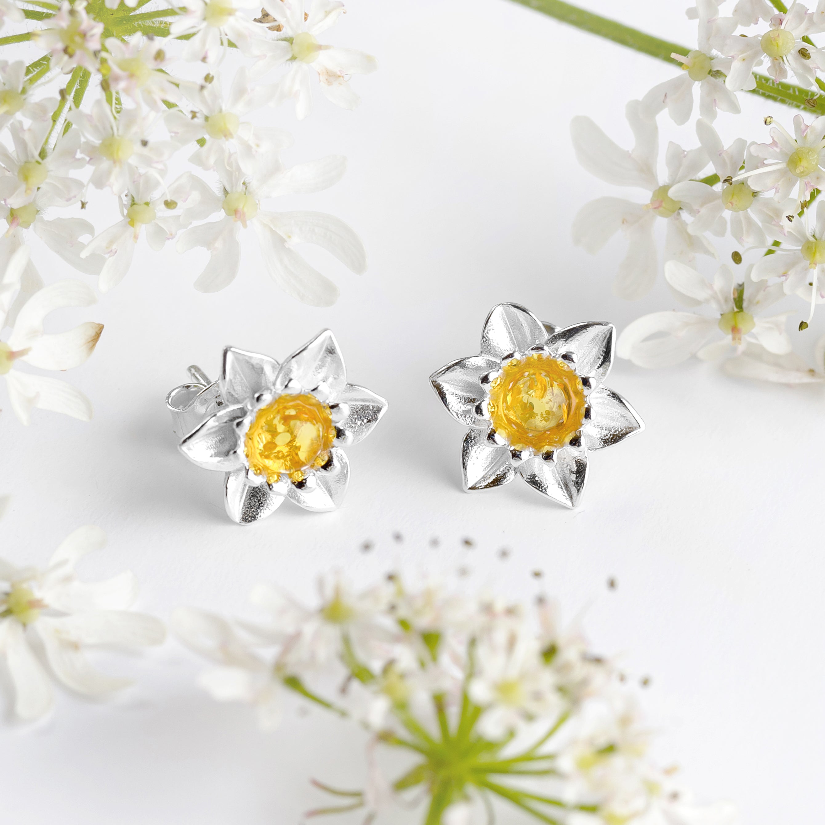 Daffodil Flower Stud Earrings in Silver and Yellow Amber
