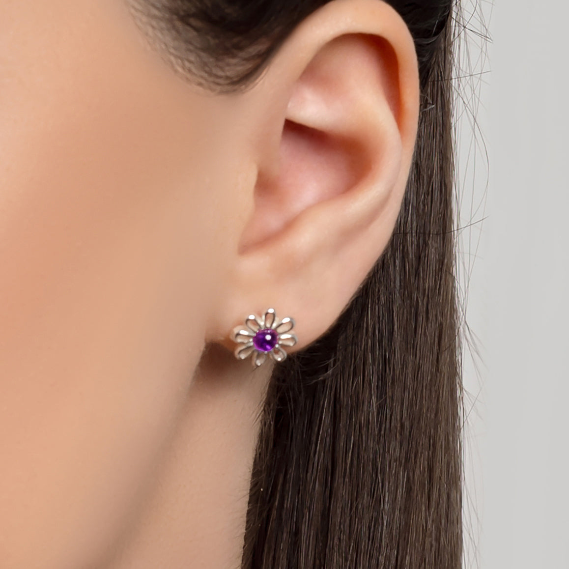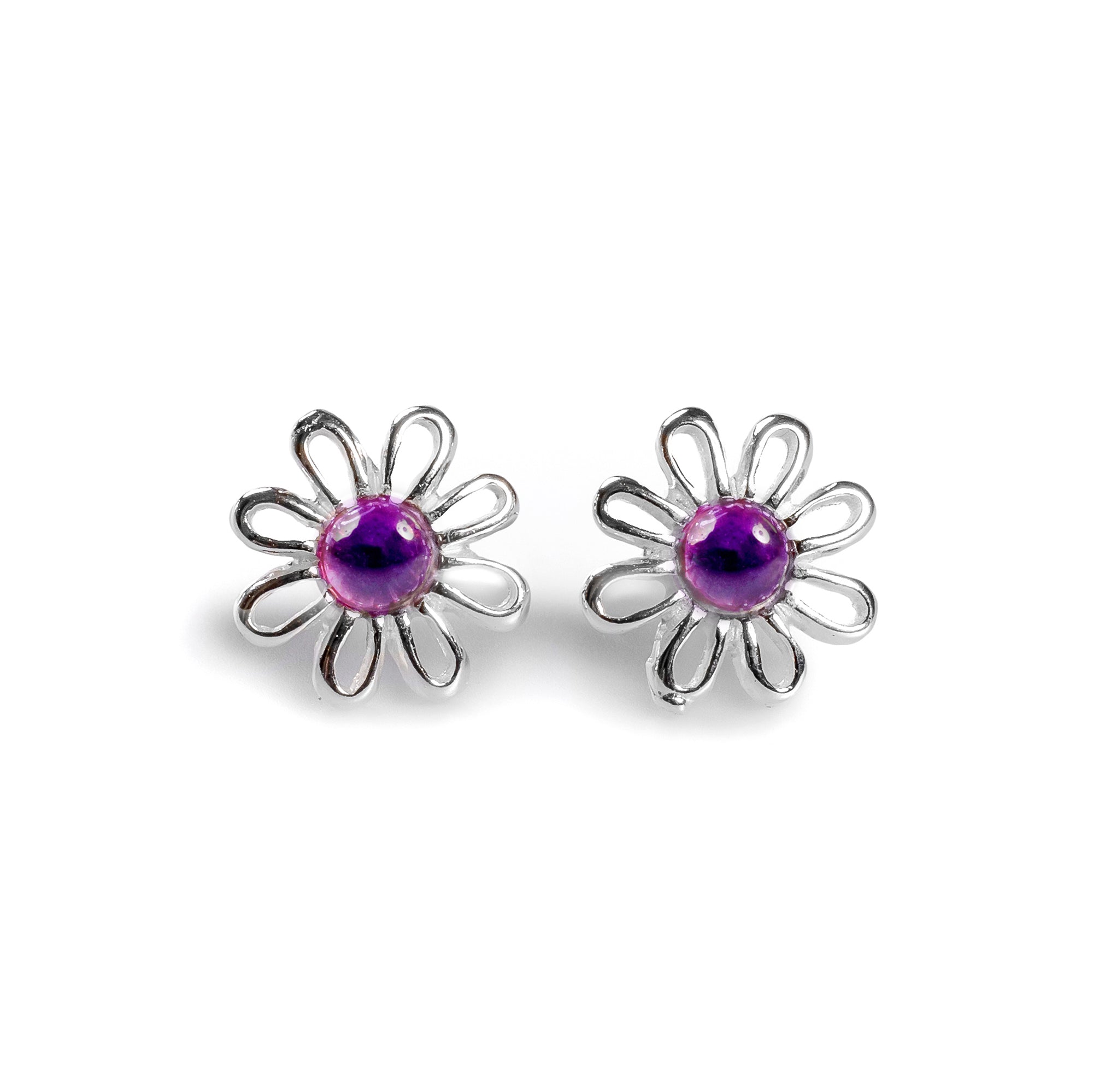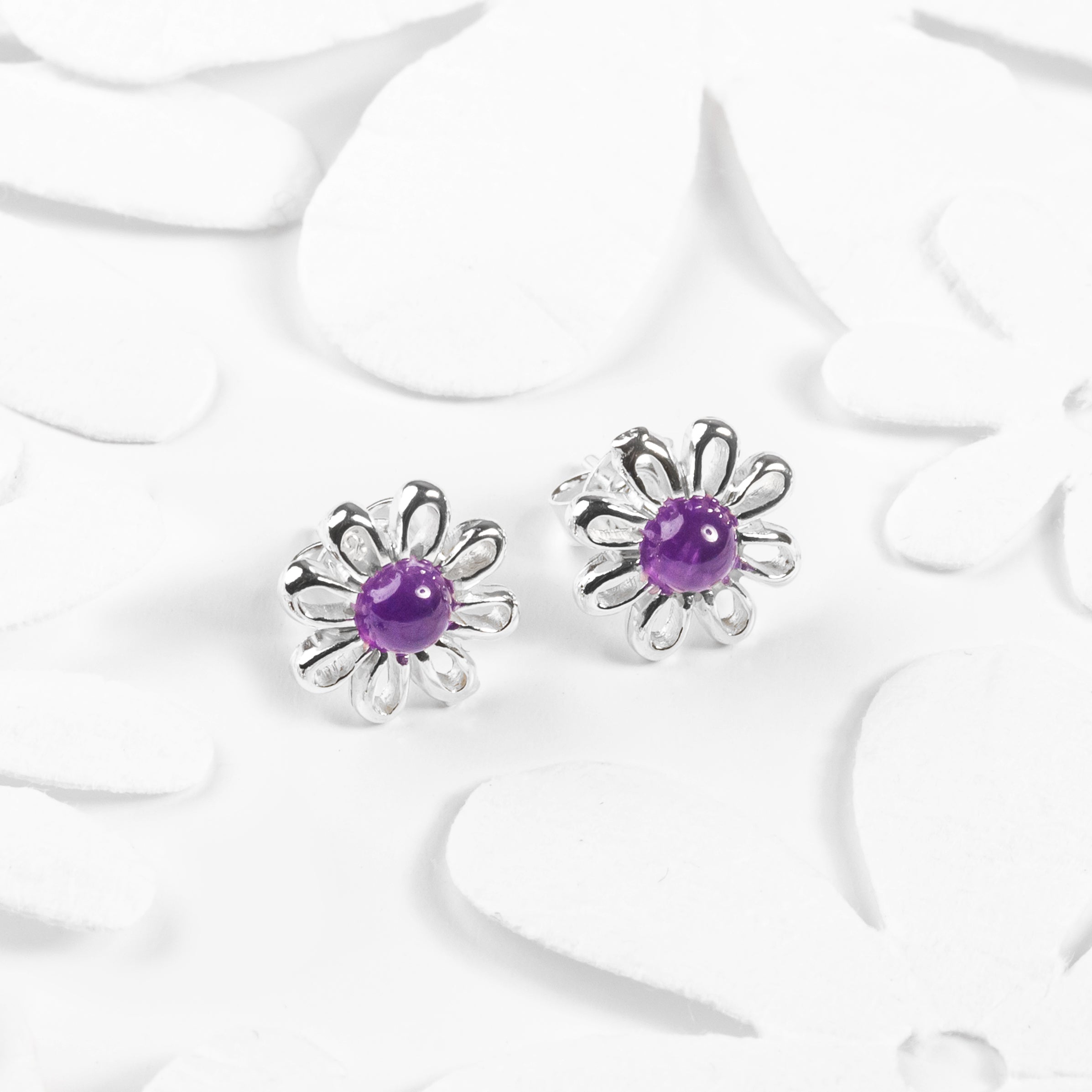 A sweet pair of silver Daisy Stud Earrings with a central piece of Amethyst. The perfect gift for yourself or a friend.