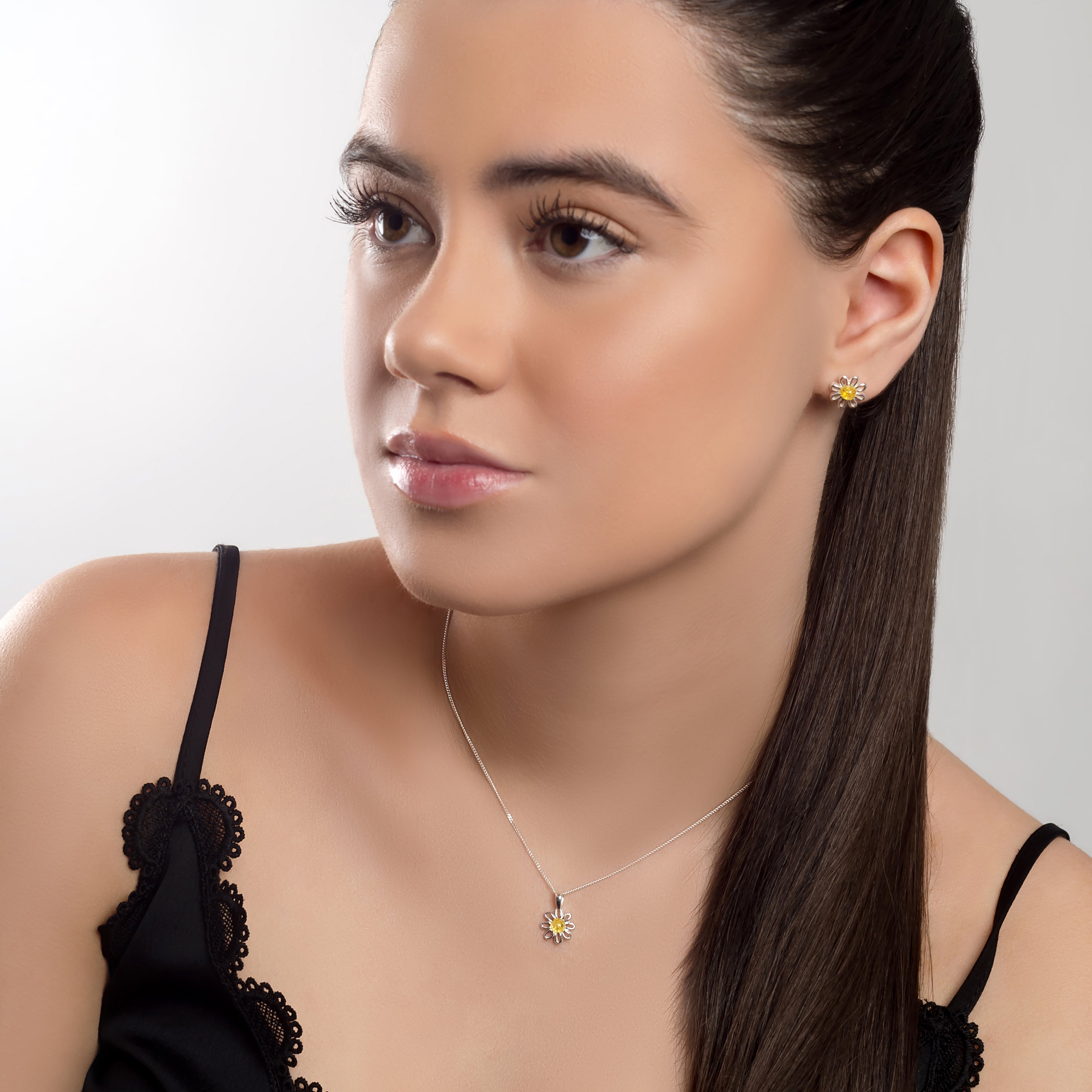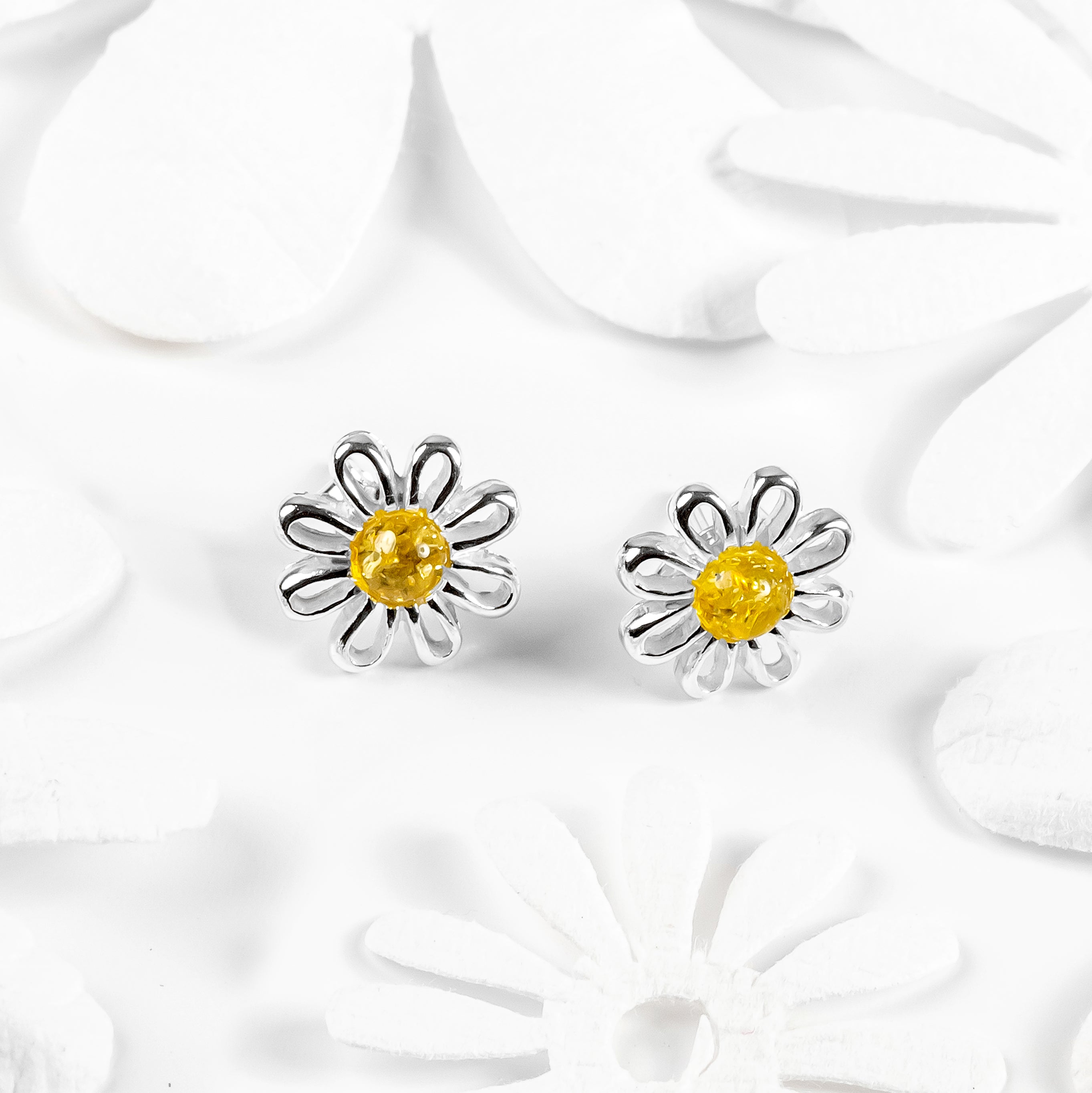 A sweet pair of silver Daisy Stud Earrings with a central piece of round amber. The perfect gift for yourself or a friend.