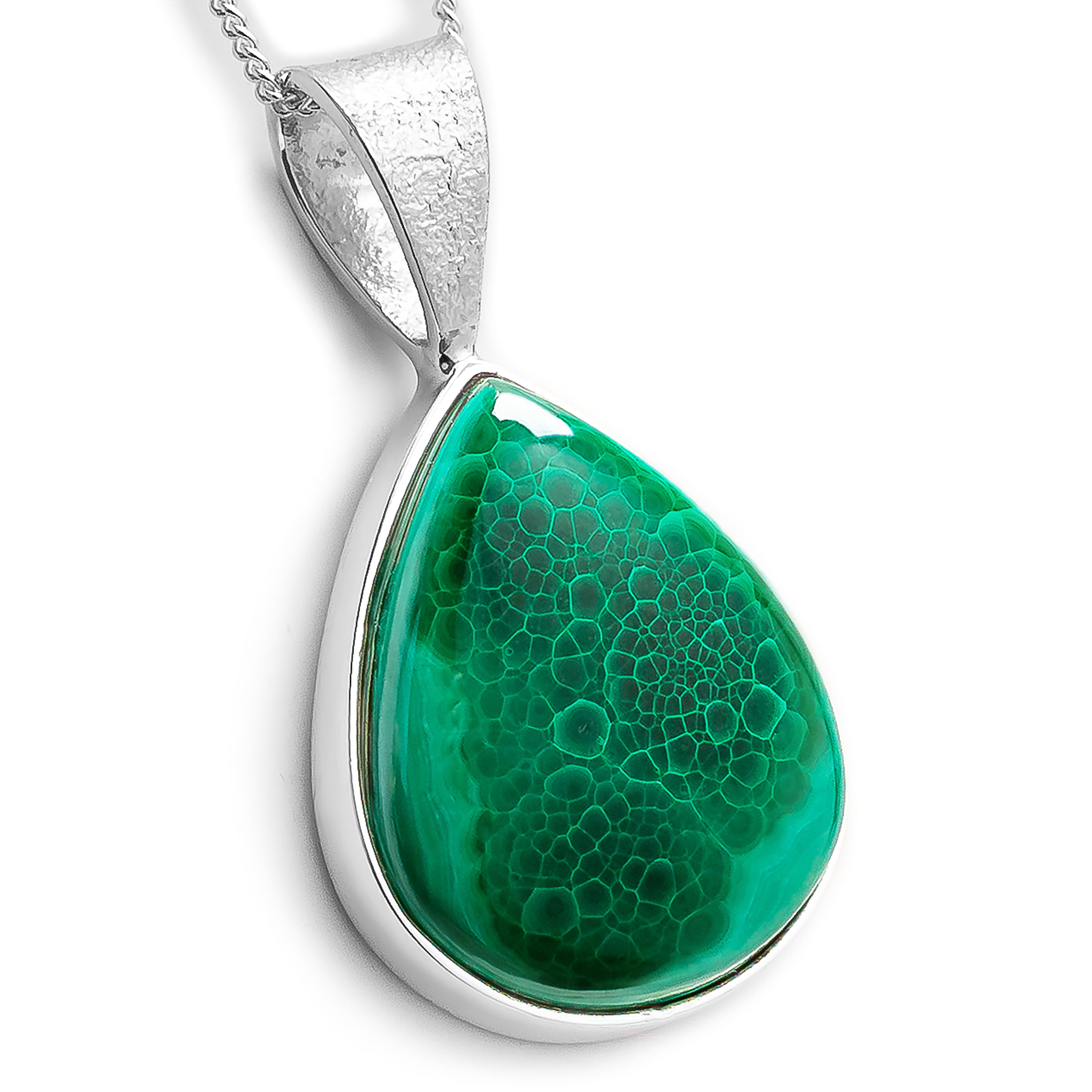 Discover the breathtaking allure of this Natural African Malachite Necklace, sourced straight from Zaire and set by hand in a lustrous Sterling Silver mount.