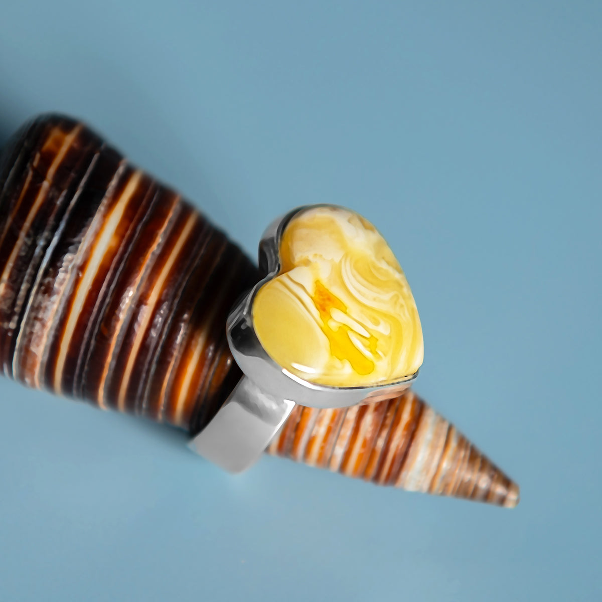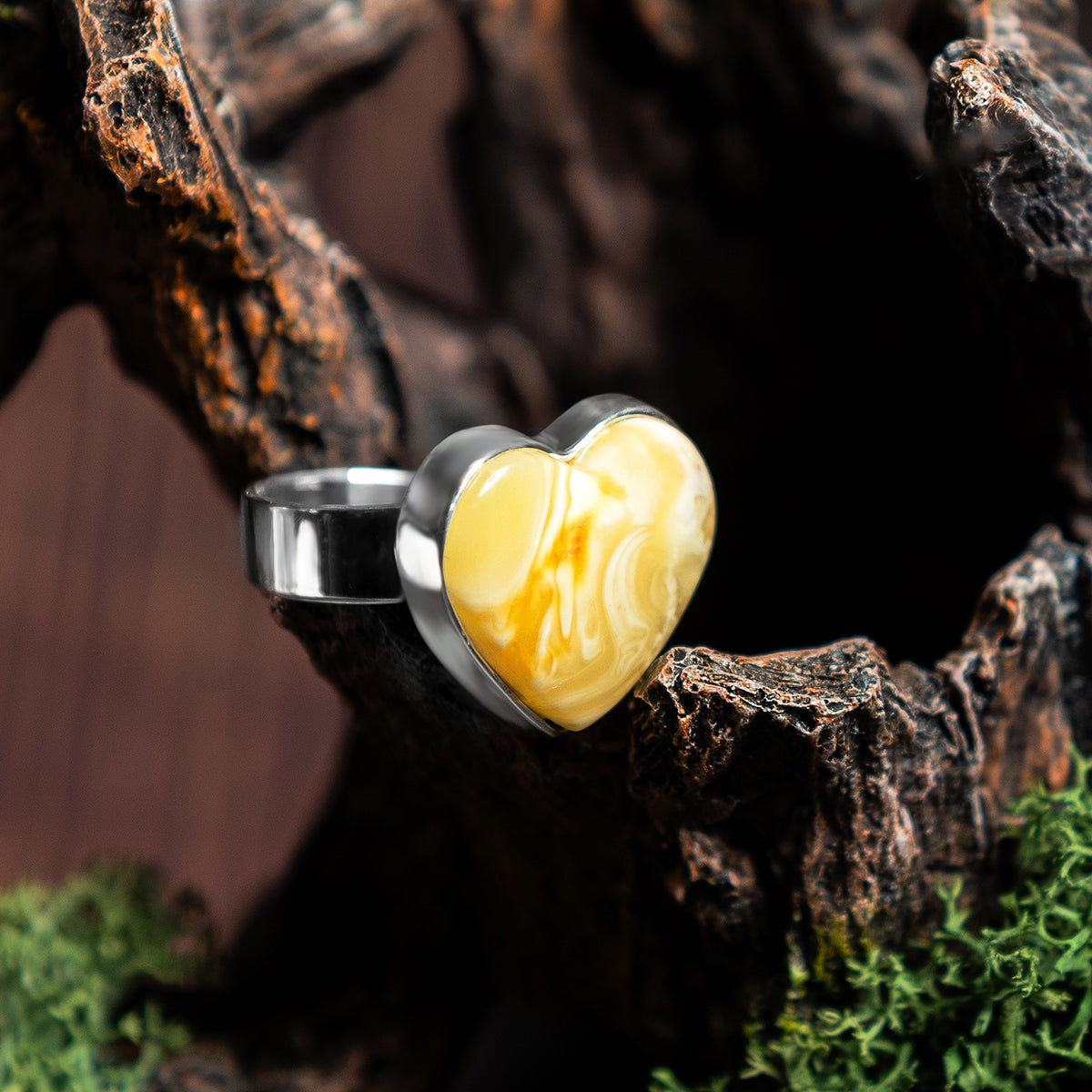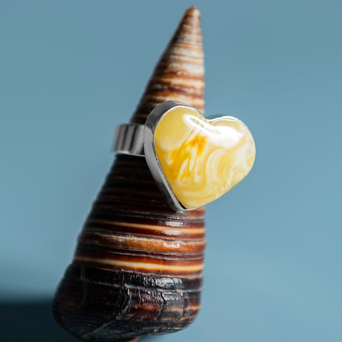 Fall in love with this Rare Natural Milky Baltic Amber Heart Ring in Silver.