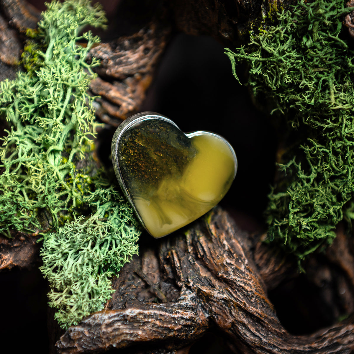 Celebrate nature’s artistry with the Natural Beauty: Baltic Green Amber Heart Ring in Silver. At its centre lies a captivating heart-shaped green amber stone, prized for its rare, earthy hue and soft, luminous glow. Each stone carries its own unique inclusions, making every ring a one-of-a-kind treasure.